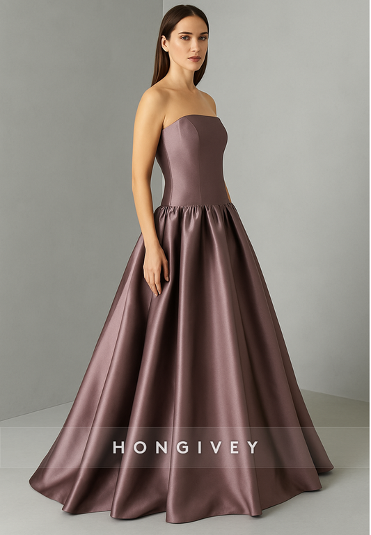 Strapless Satin Floor-Length Sleeveless Pleated Princess Evening Gowns