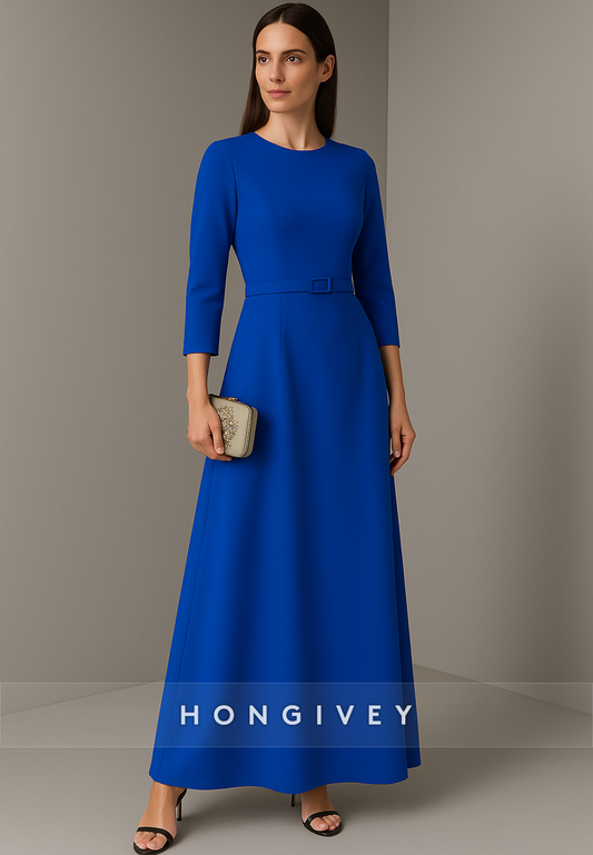 Royal Blue 3/4 Sleeve Ankle-Length A-Line Waistband Pleated Evening Gowns