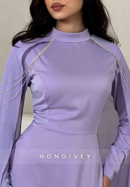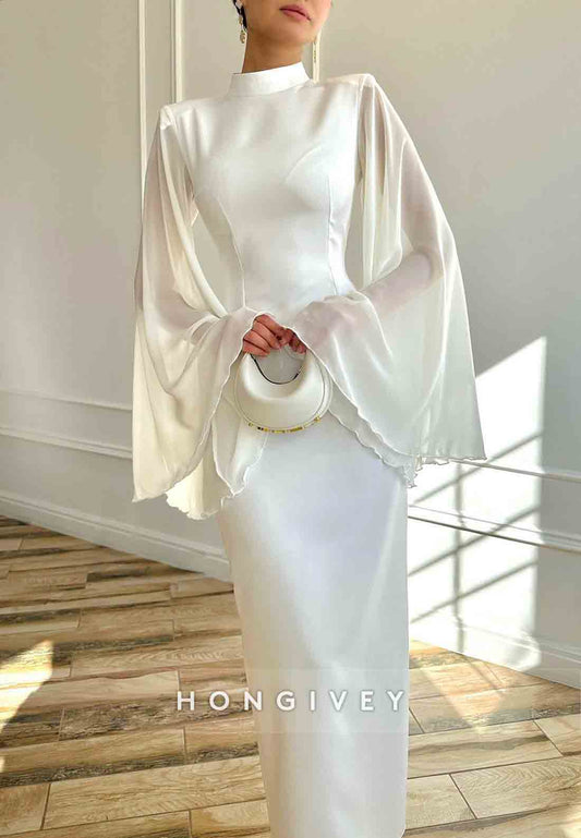 High Neck Long Sleeves Sheath Elastic Satin Pleated Tea-Length Evening Gowns