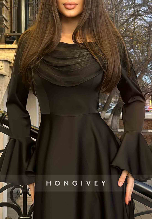 Cowl Neck Ankle-Length Bell Sleeves Pleated A-Line Evening Gowns