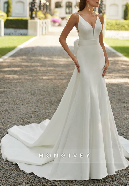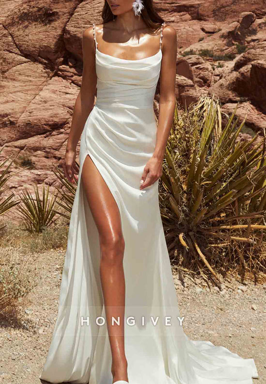 Tie Back Pleated Trumpet Spaghetti Straps Floor-Length Wedding Dresses