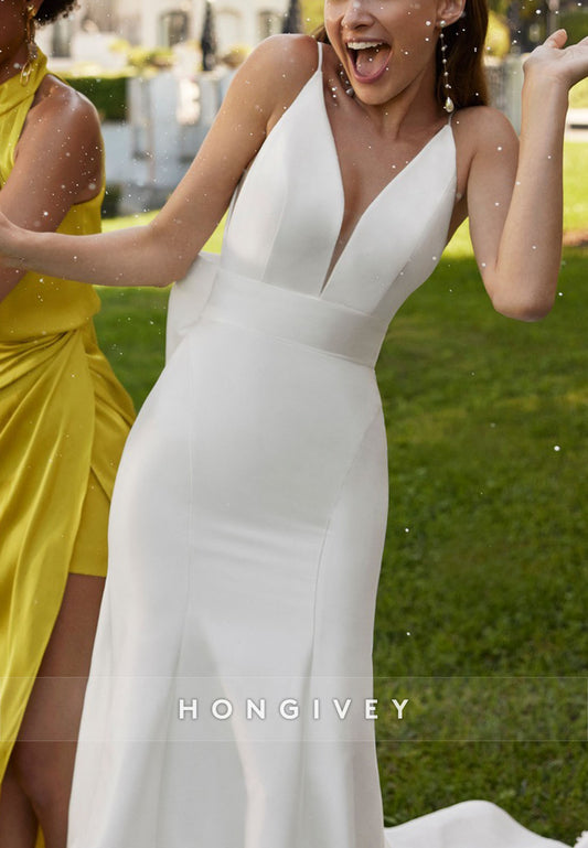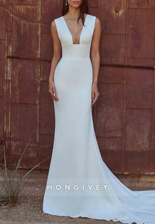 H0981 - Simple Sexy Halter V-Neck Open Back With Train Long Wedding Dress