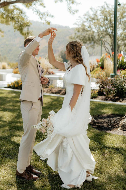 Fairy A Line V Neck Satin Wedding Dresses with Sleeves