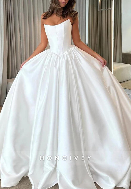 Sleeveless Ball Gown Satin Pleated Chapel Train Low Back Wedding Dresses