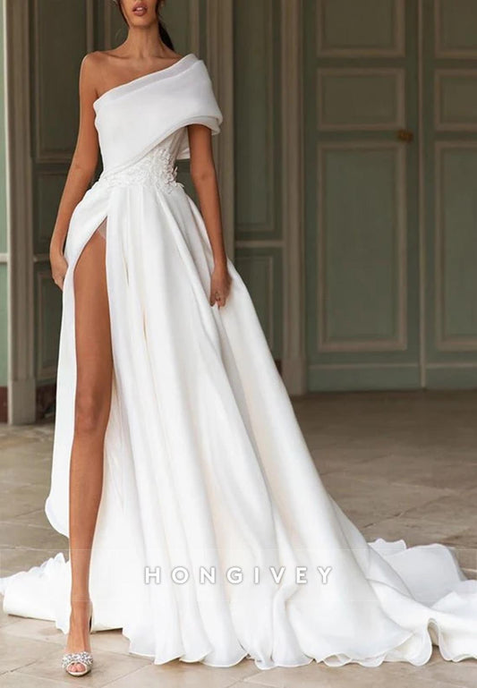 One Shoulder Pleated Sleeveless Sweep Train Satin Wedding Dresses