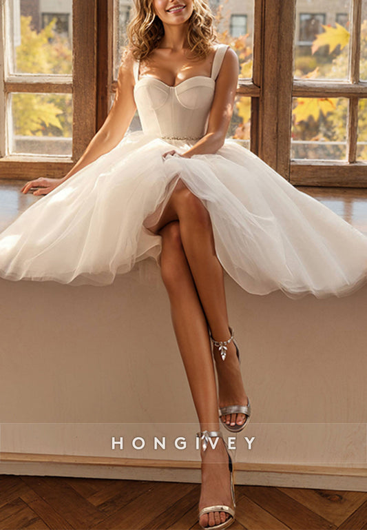 Chic Straps A-Line Tulle Side Slit with Train Bride Wedding Dress Gown HONGIVEY