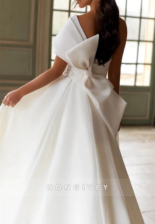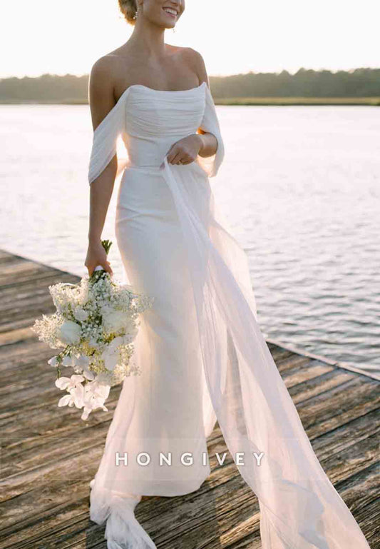 Pleated Low Back Off the Shoulder Floor-Length Beach Wedding Dresses