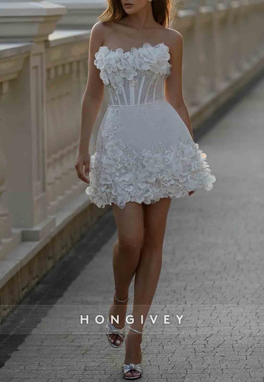 H1744 - Tulle A-Line Strapless Sheer Lace Applique Wedding Dress
