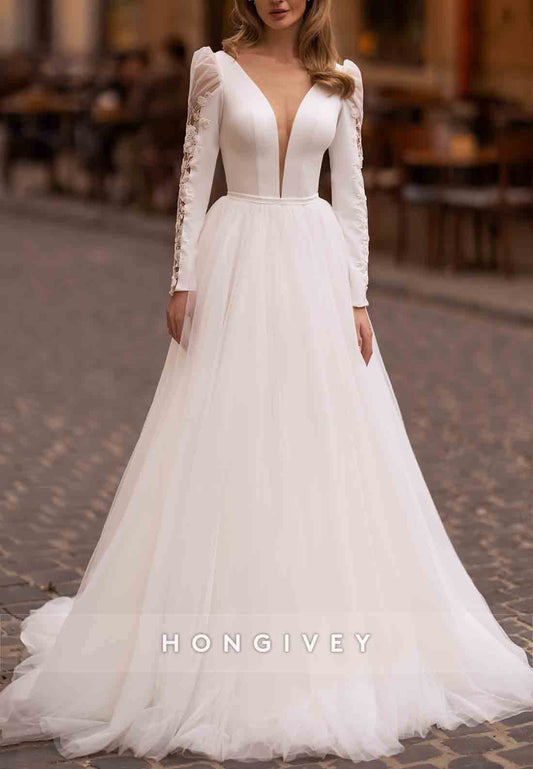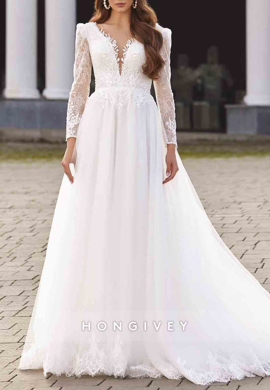 Elegant V-Neck Long Sleeve A-Line Appliques With Side Slit Wedding Dress
