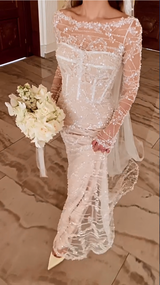 Fashion Sequins Flowers Long Sleeve Mermaid Wedding Dress