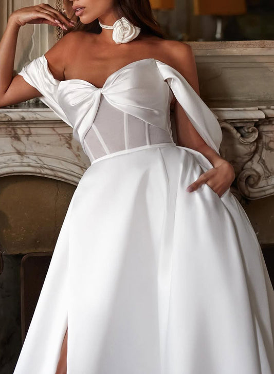 Chic Sheath Long Wedding Dresses Satin White Bridal Dresses Off-shoulder Bridal Gowns