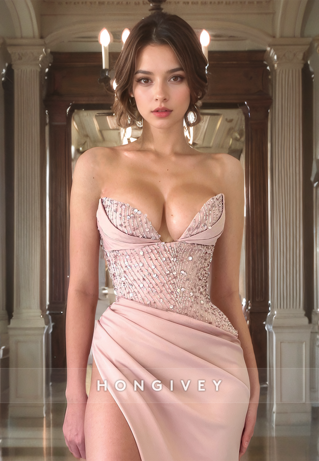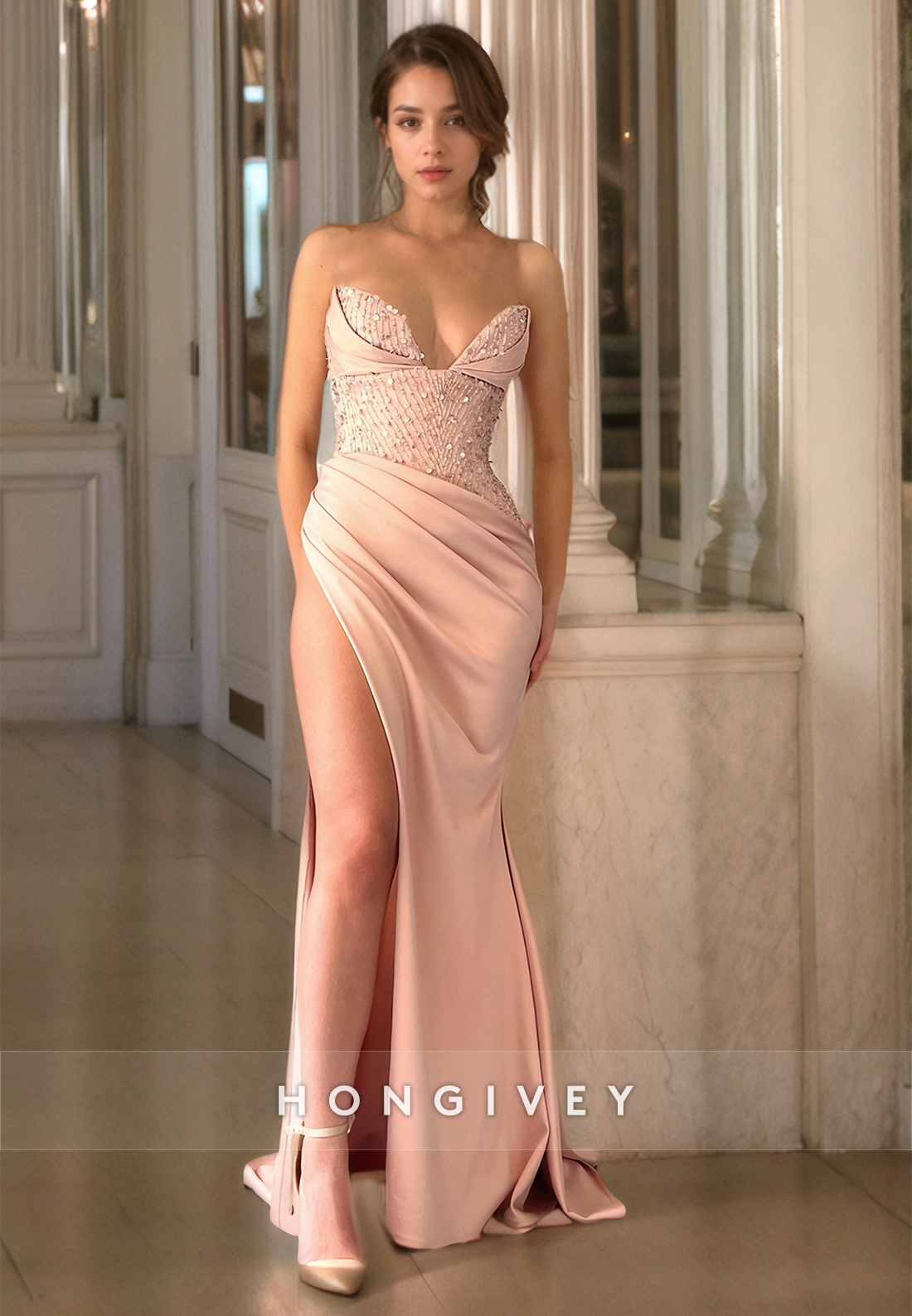 Beaded Lace Sequins Sparkly High Slit With Train Party Evening Prom Dress