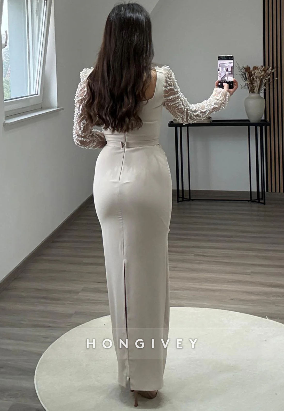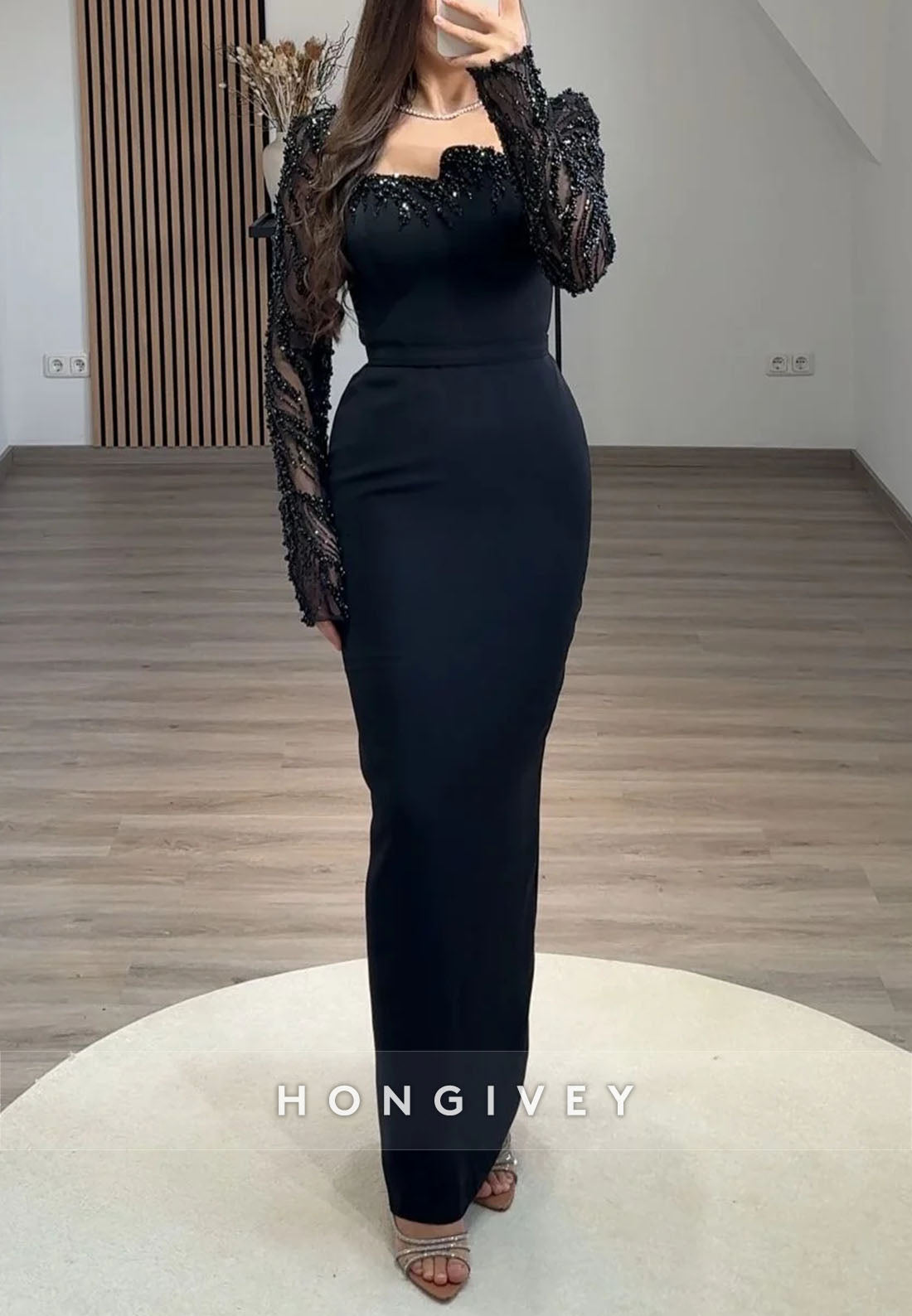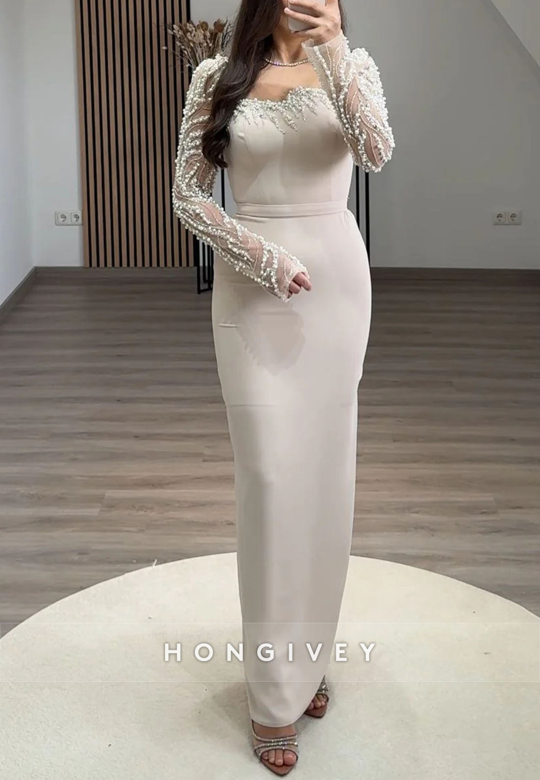 Column Asymmetrical Neck Evening Gown Long Sleeve Beading Ankle-Length Formal Dresses
