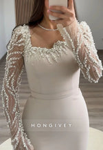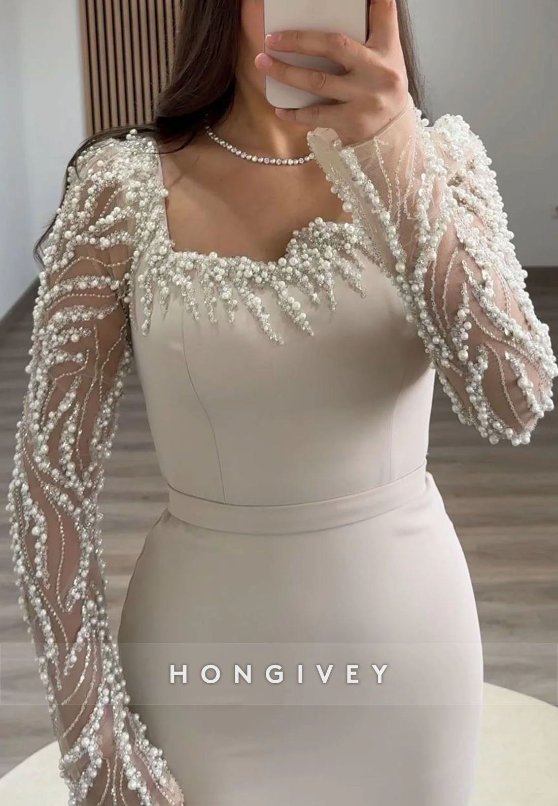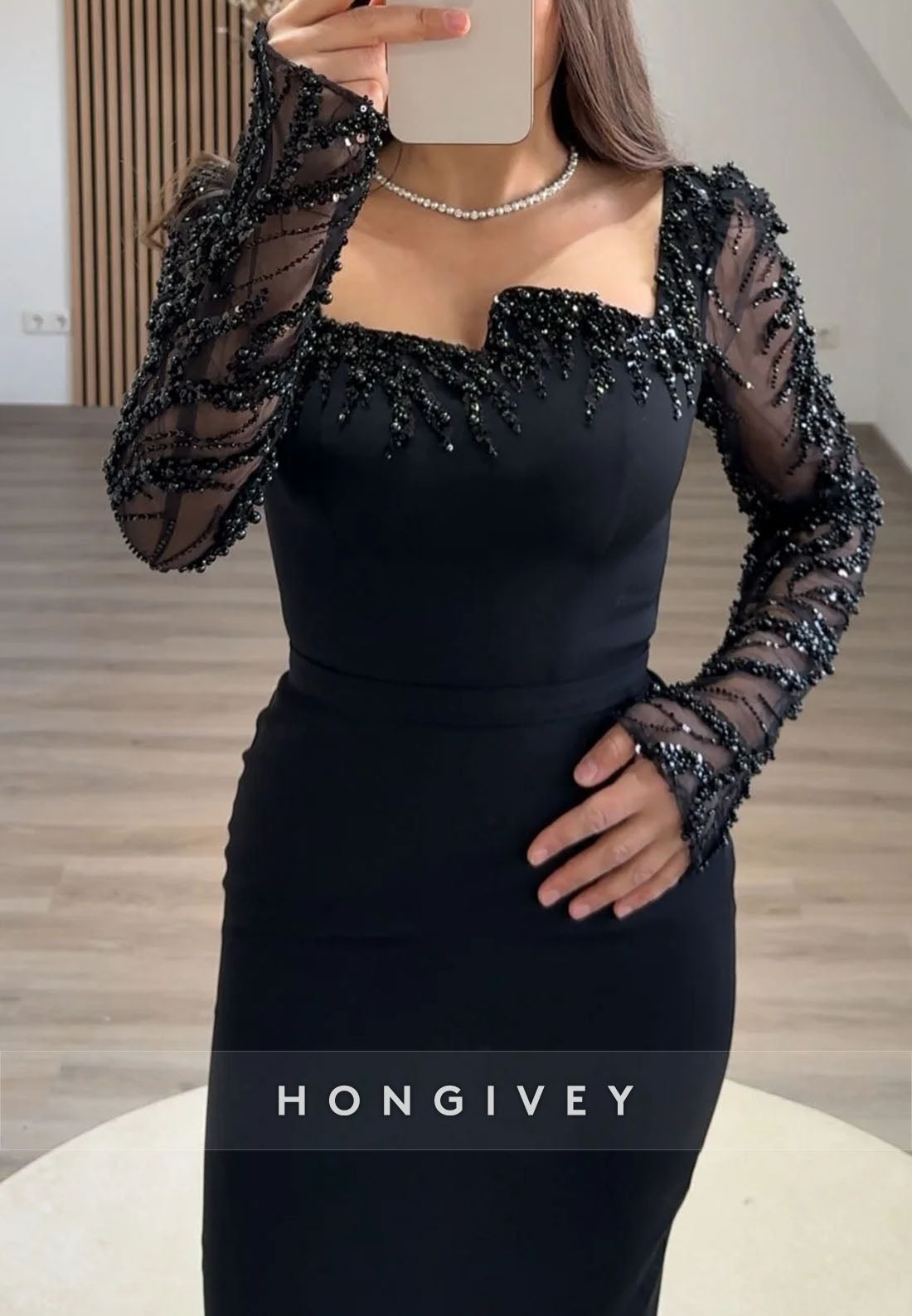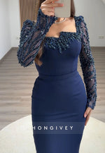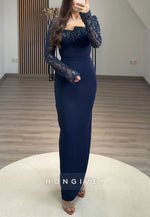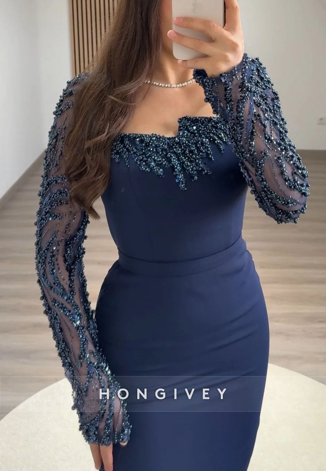 Column Asymmetrical Neck Evening Gown Long Sleeve Beading Ankle-Length Formal Dresses