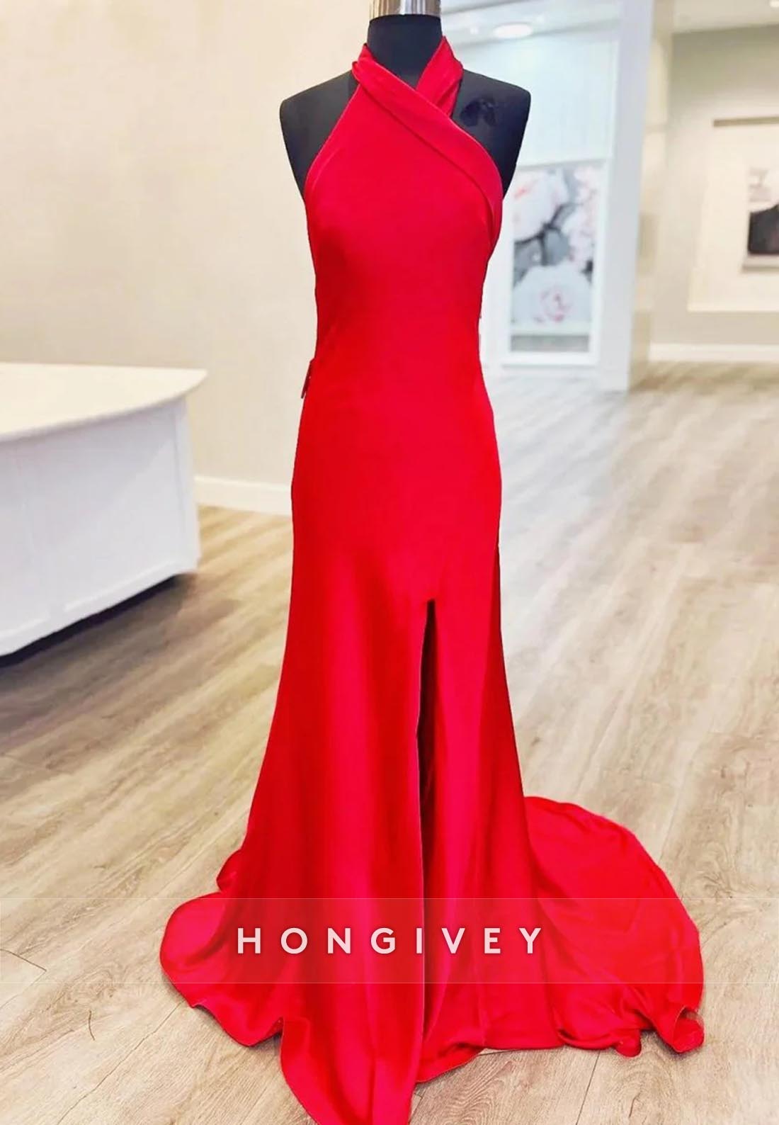 Halter Mermaid Split Guest of Wedding Prom Dresses with Sweep Train