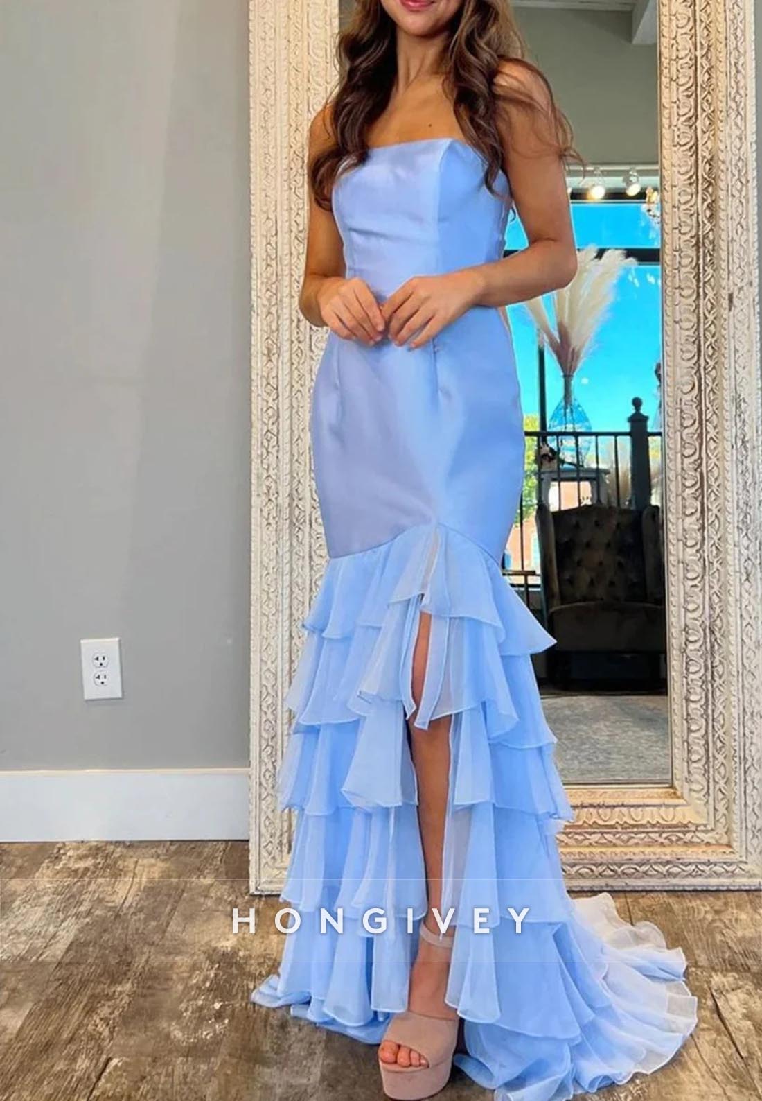 Tube Top Slit Tiered Mermaid Long Prom Dresses with Brush Train