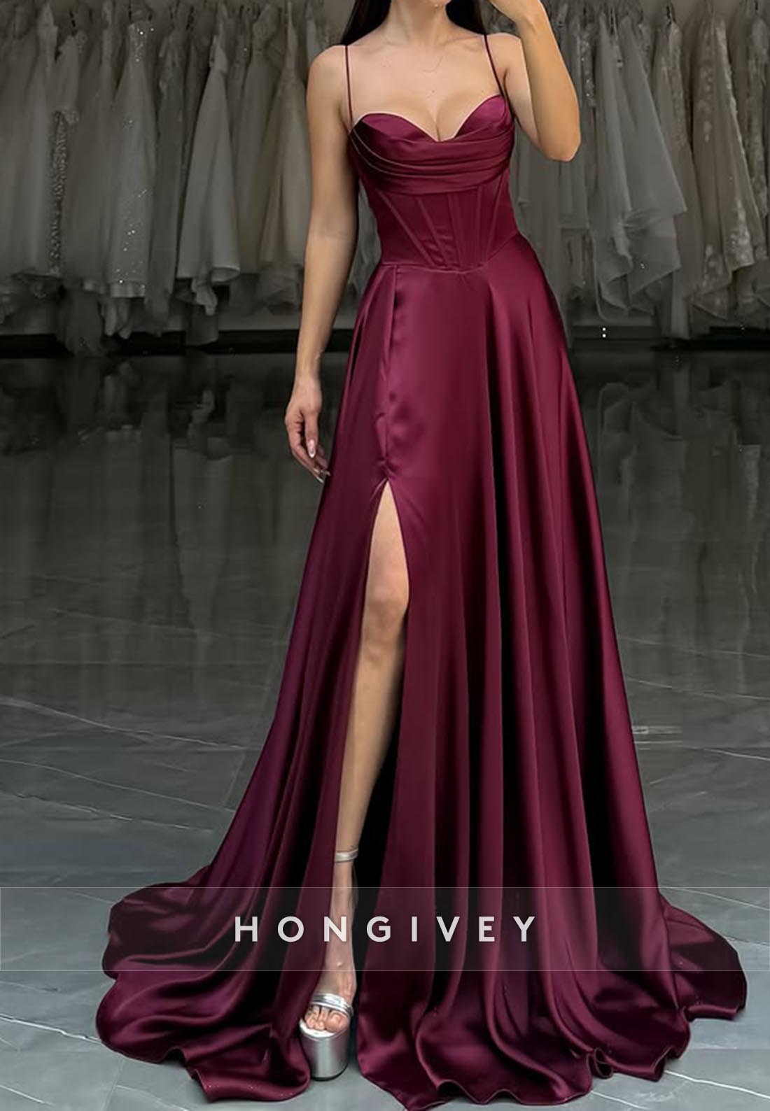Spaghetti Straps Sweetheart Pleats Split Evening Prom Dresses with Court Train