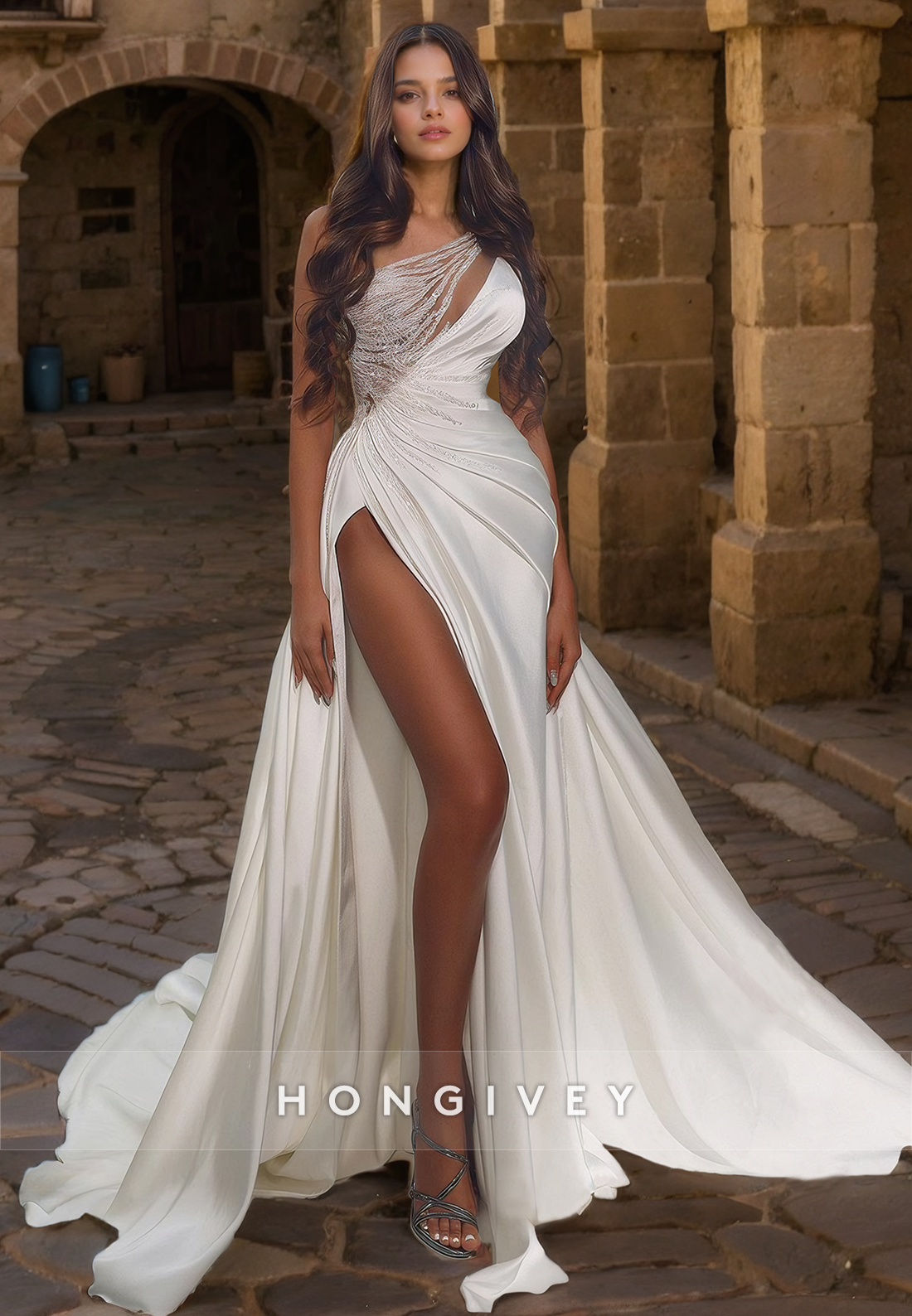 Beaded Rhinestone Draped Illusion Cutout High Slit With Train Wedding Dress