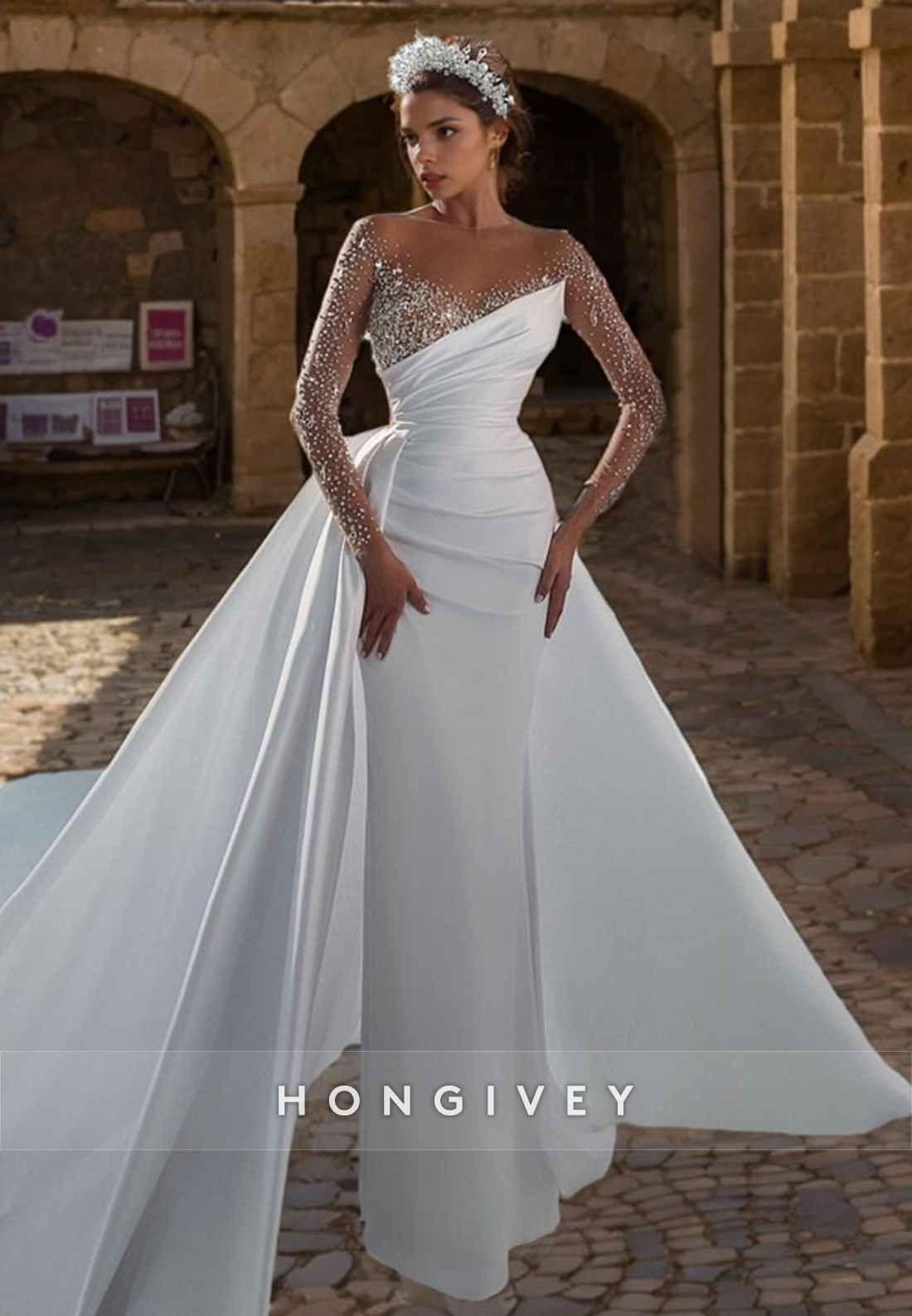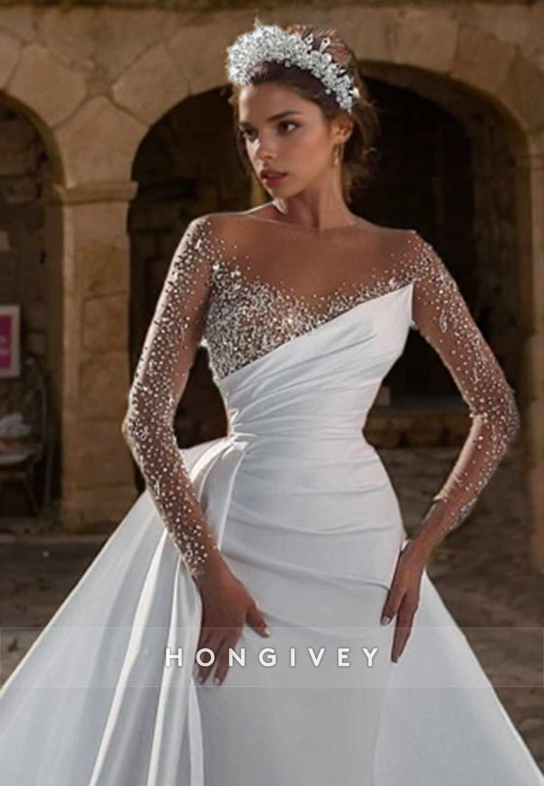Illusion Cutout Rhinestone Beaded Sparkly With Train Wedding Dress