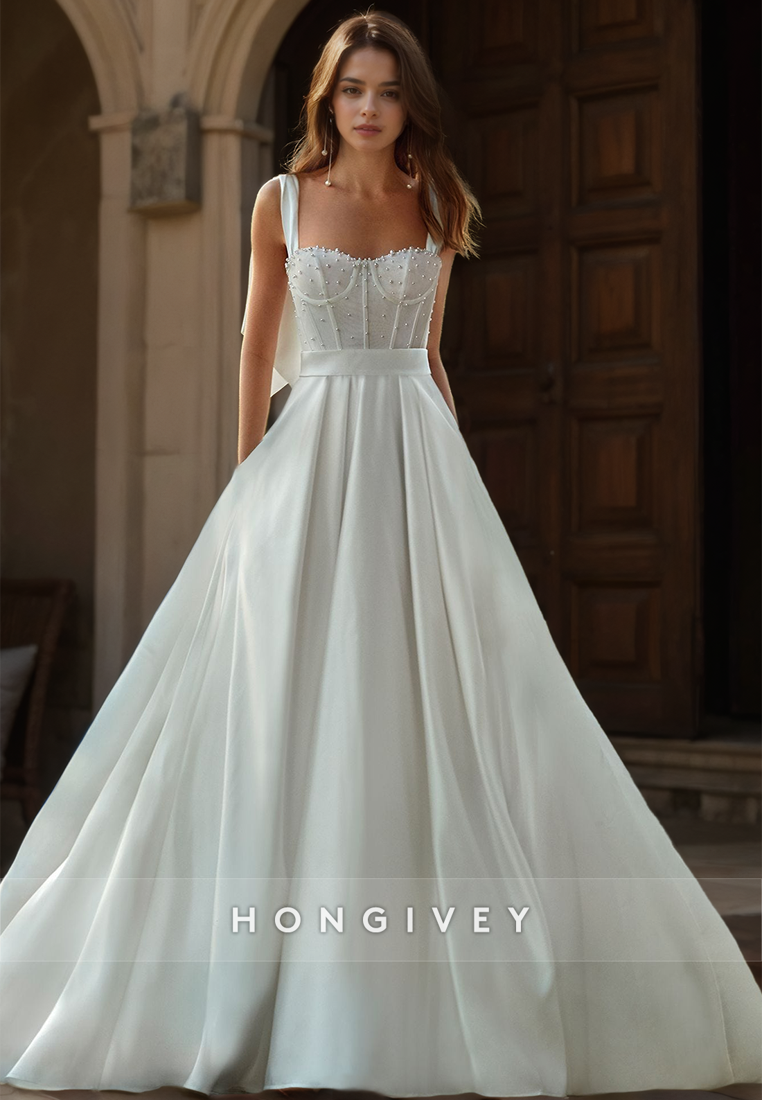 Pearl Beaded With Train And Bow Detail Long Wedding Dress
