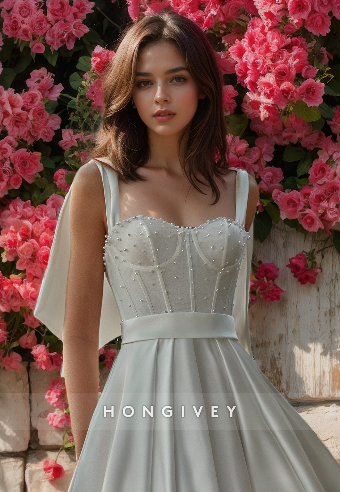 Look stunningly beautiful on your wedding day in the H0911 – Pearl Beaded With Train And Bow Detail Long Wedding Dress. This gorgeous dress features a structured silhouette and a romantic train with an intricate pearl beading and bow detail that will make you feel like royalty. With its timeless design and timeless craftsmanship, you can be sure to look your very best on your special day.