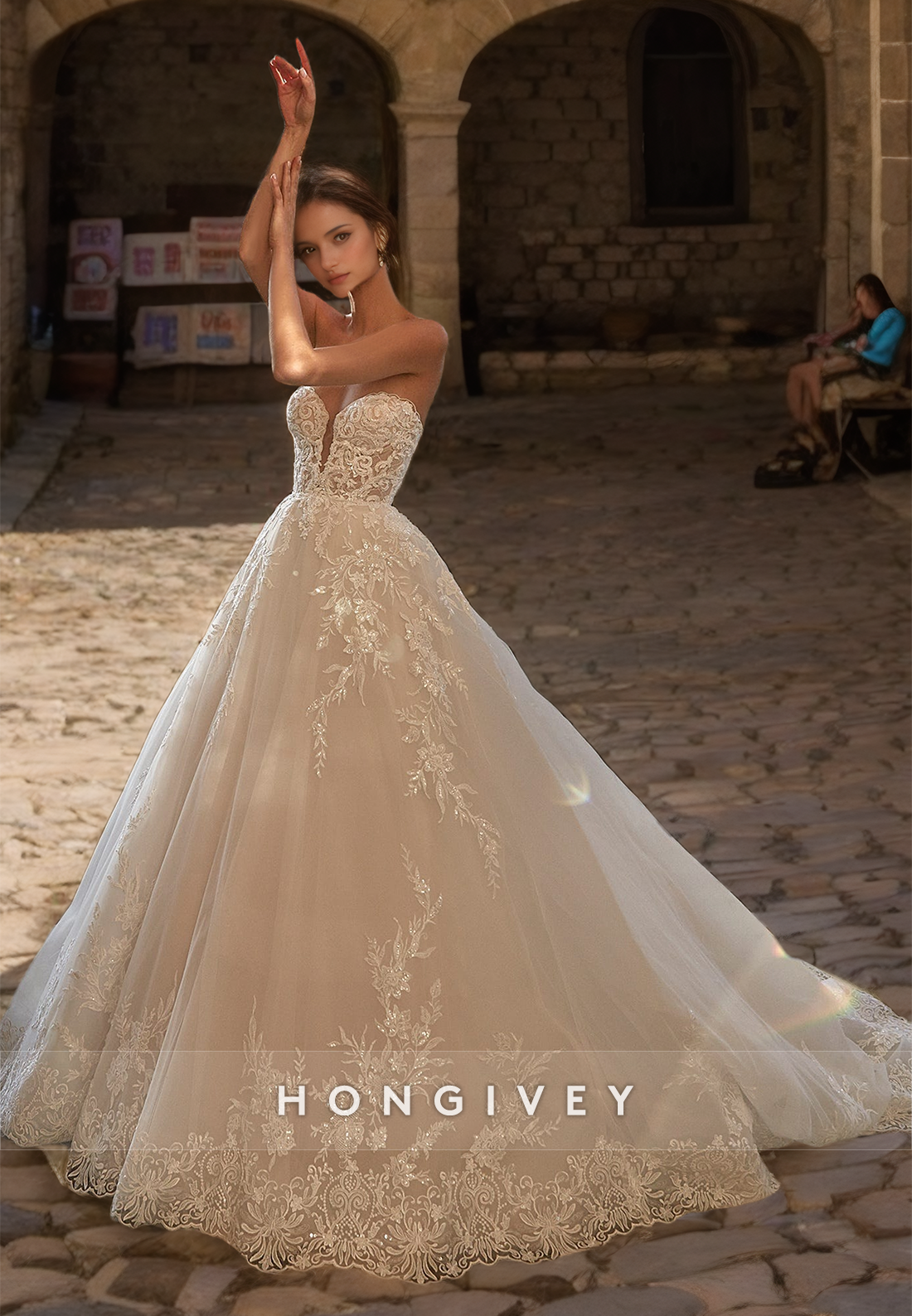 HONGIVEY New Lace Wedding Dresses with Train Sweetheart A-Line Organza Bridal Dress