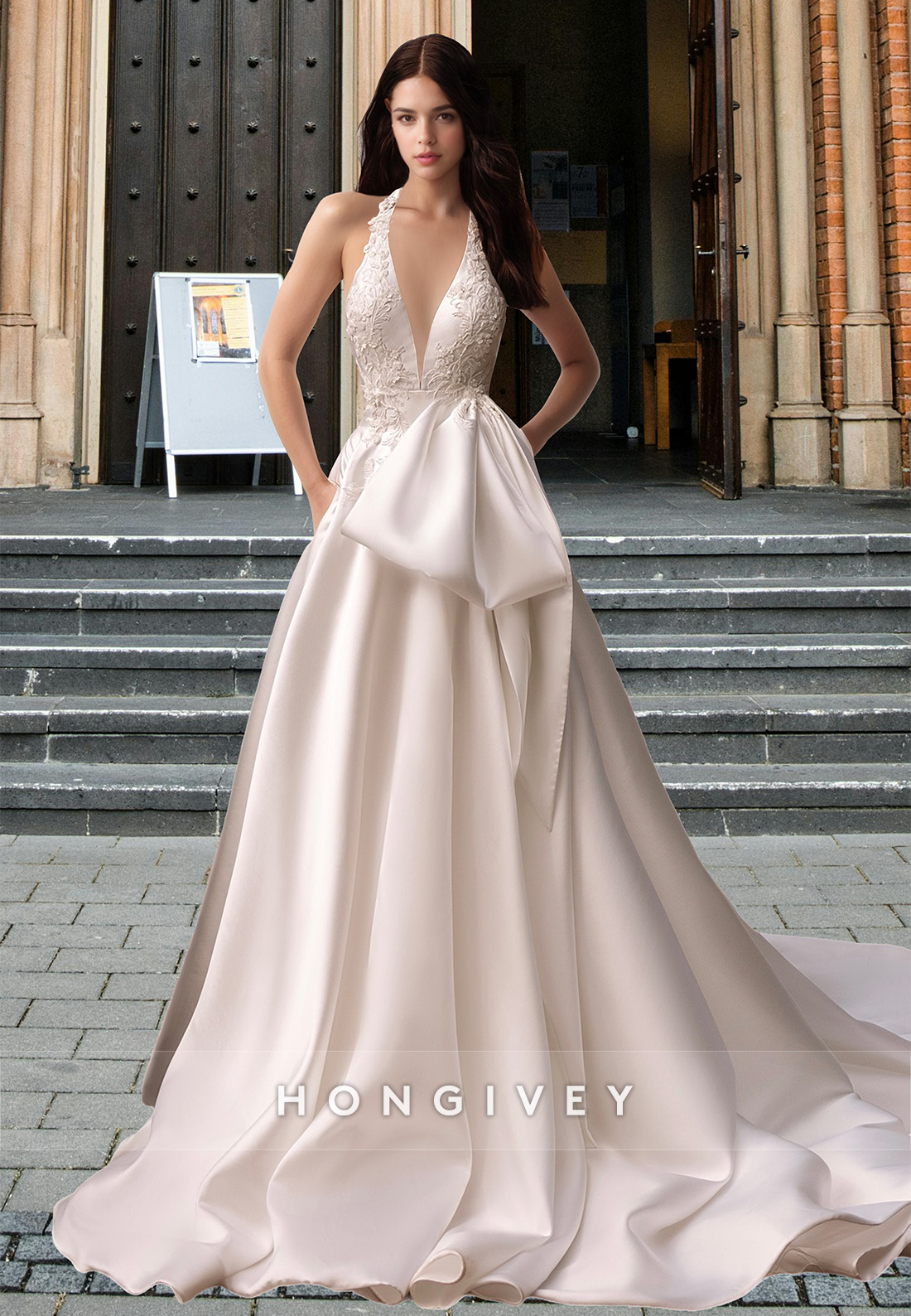 Sexy V-Neck A-Line Satin Bow with Train Wedding Dress Bride Gown HONGIVEY