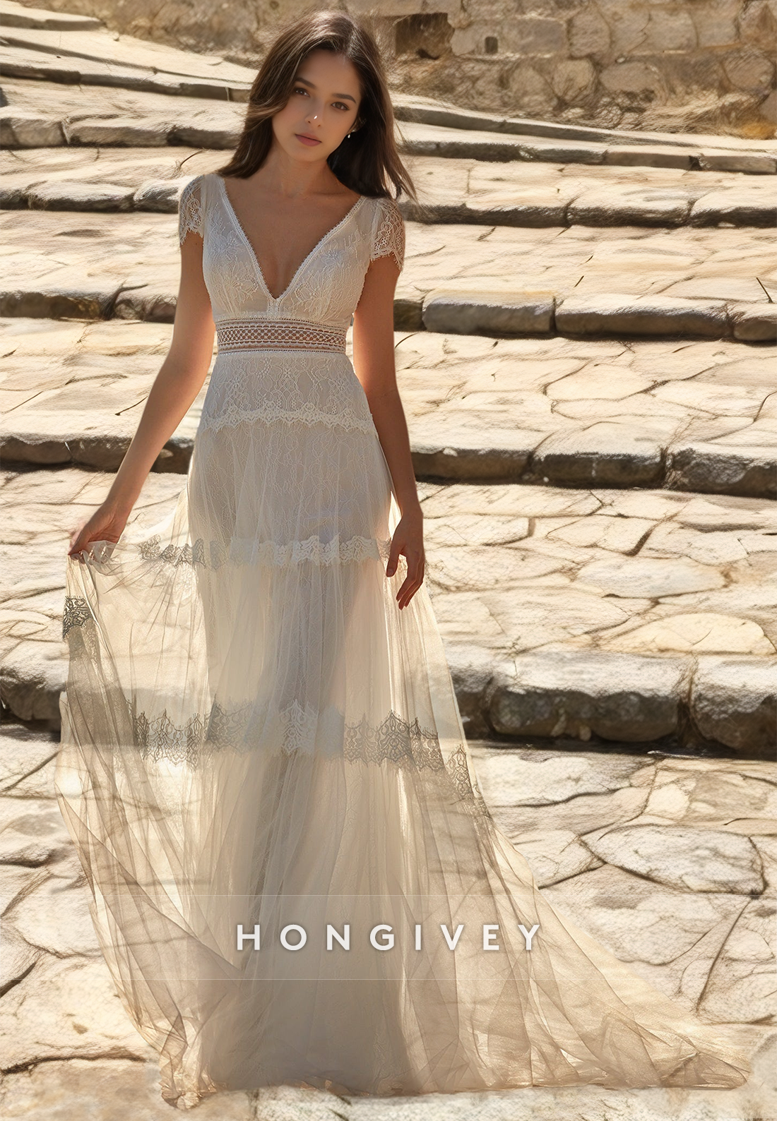 H0914 - Fully Floral Lace Tiered Illusion Cutout With Train Long Wedding Dress