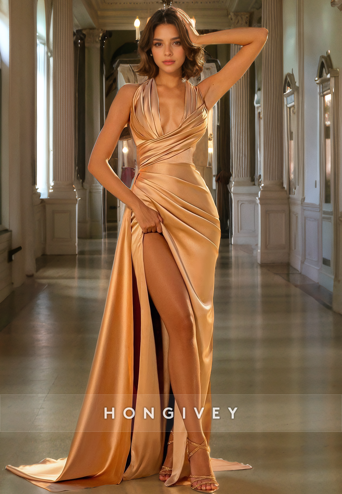 L0929 - Sexy Gold V-Neck Halter With Train And High Slit Evening Party Prom Dress