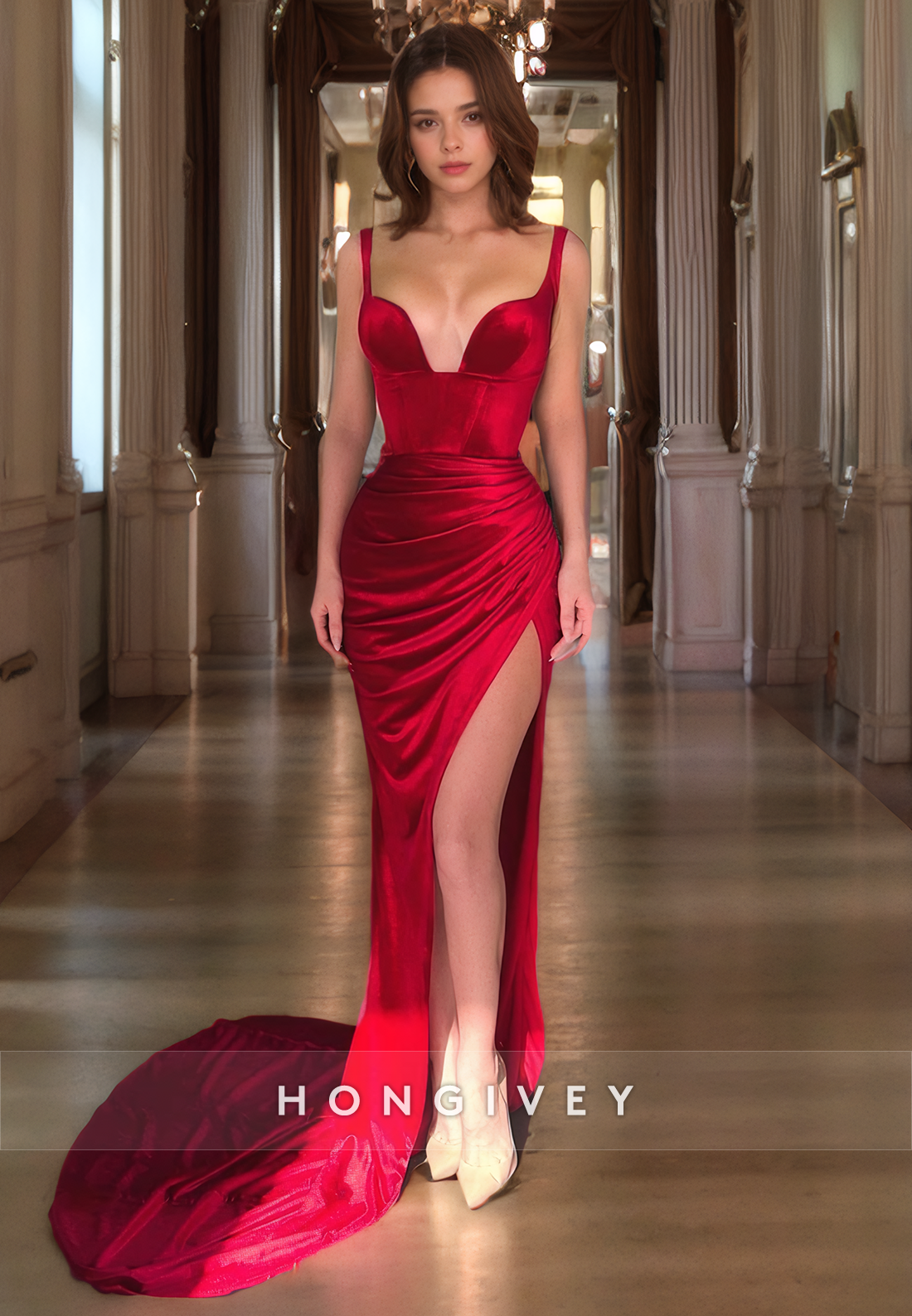 Simple Ruched With Train And Slit Formal Party Prom Evening Dress