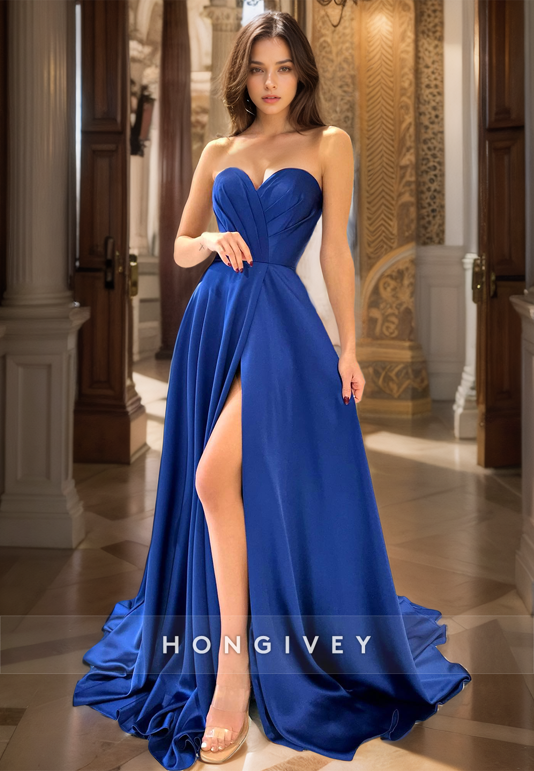L1266 - Couture Simple Ruched Strapless With Train And Slit Party Evening Prom Formal Dress