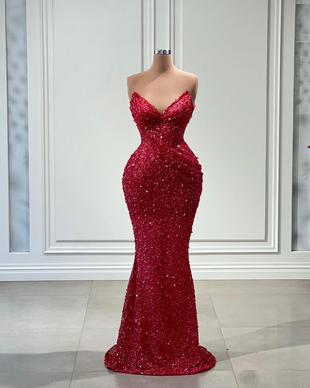Glitter Trumpet V-Neck Strapless Fully Sequined Long Prom Dress