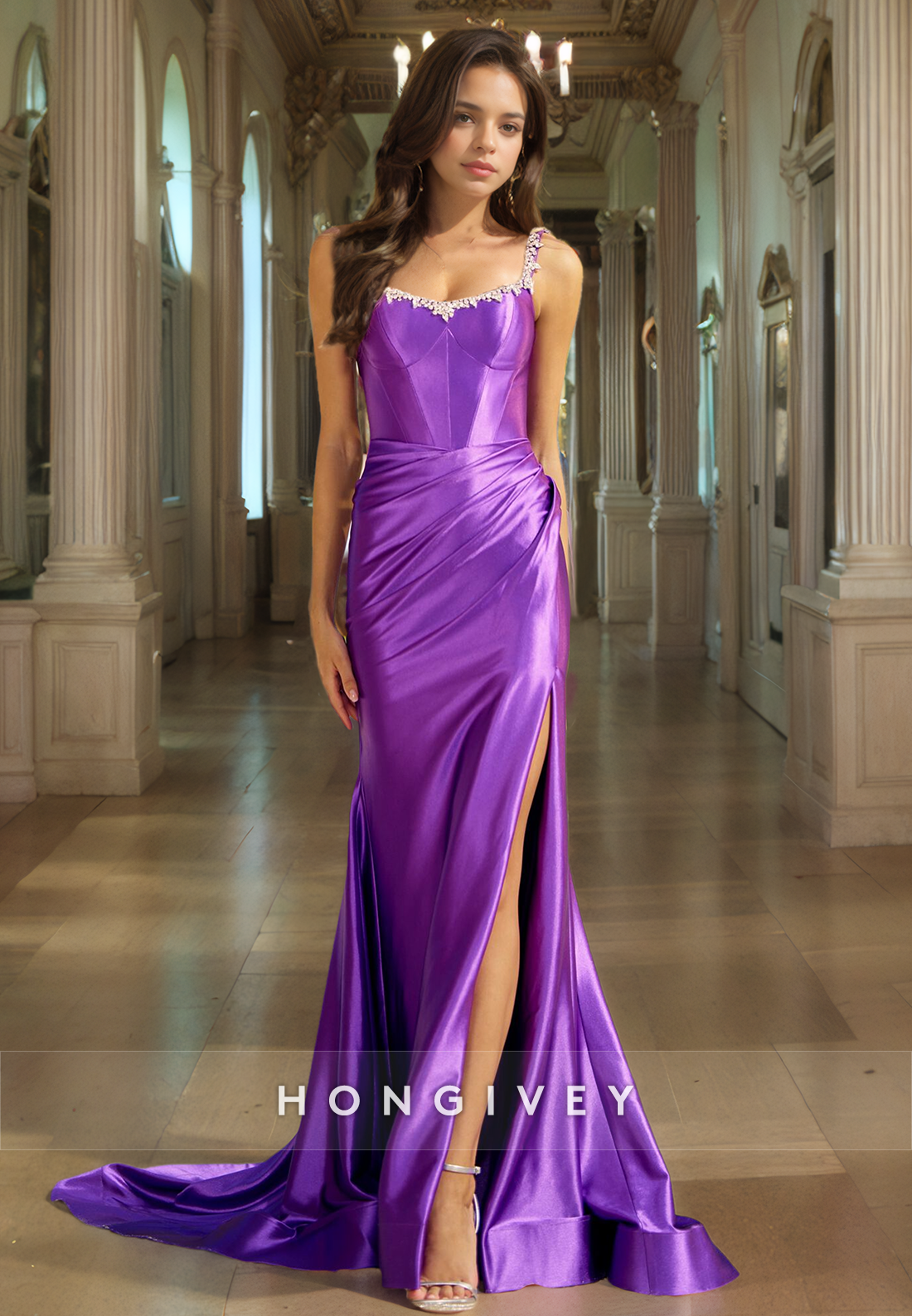 Chic Satin Trumpet Sweetheart Spaghetti Straps Beaded Long Prom Dress