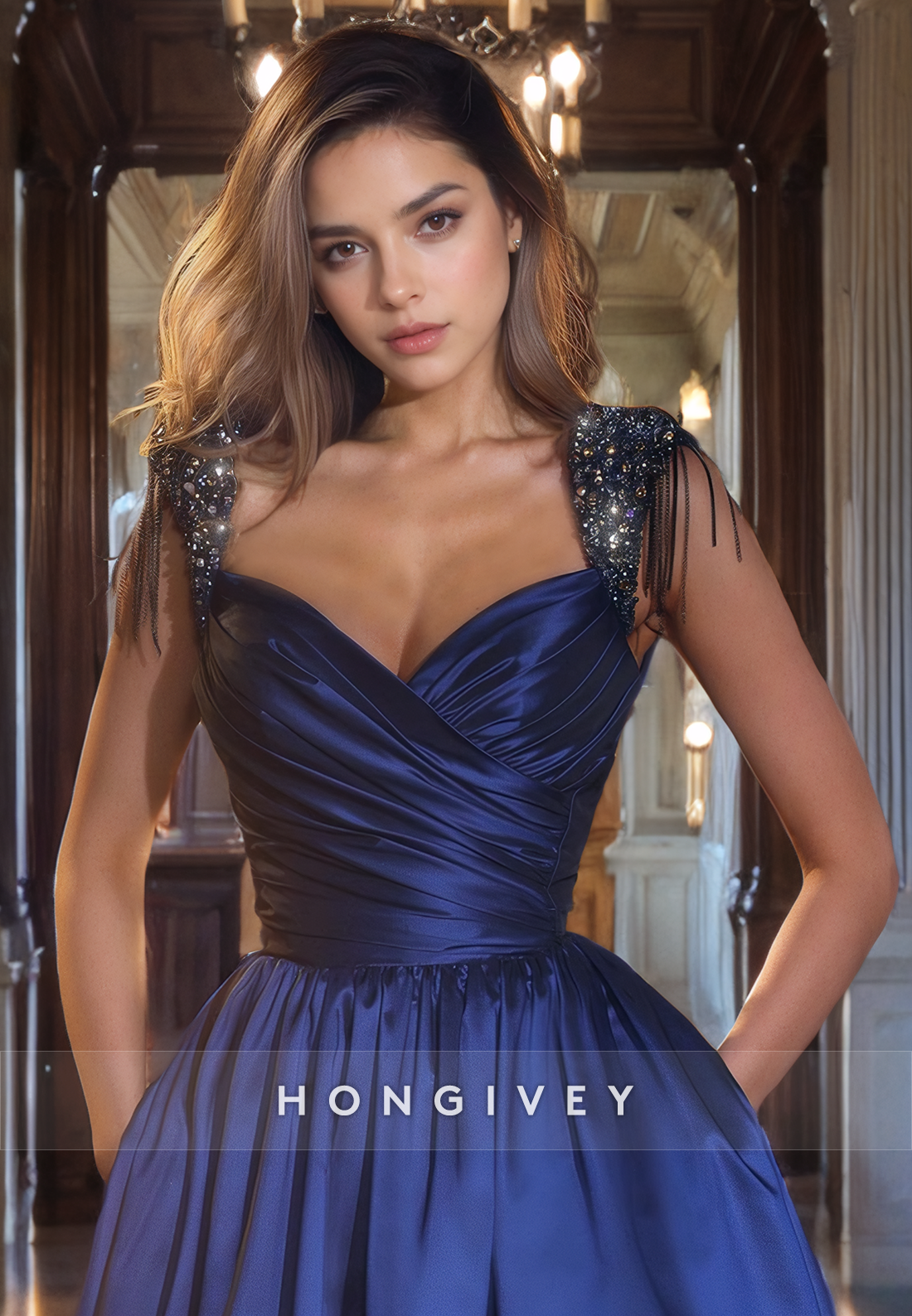 Classy Royal Blue Satin Ruched Prom Dress A-Line Sweetheart Floor Length Evening Party Dress