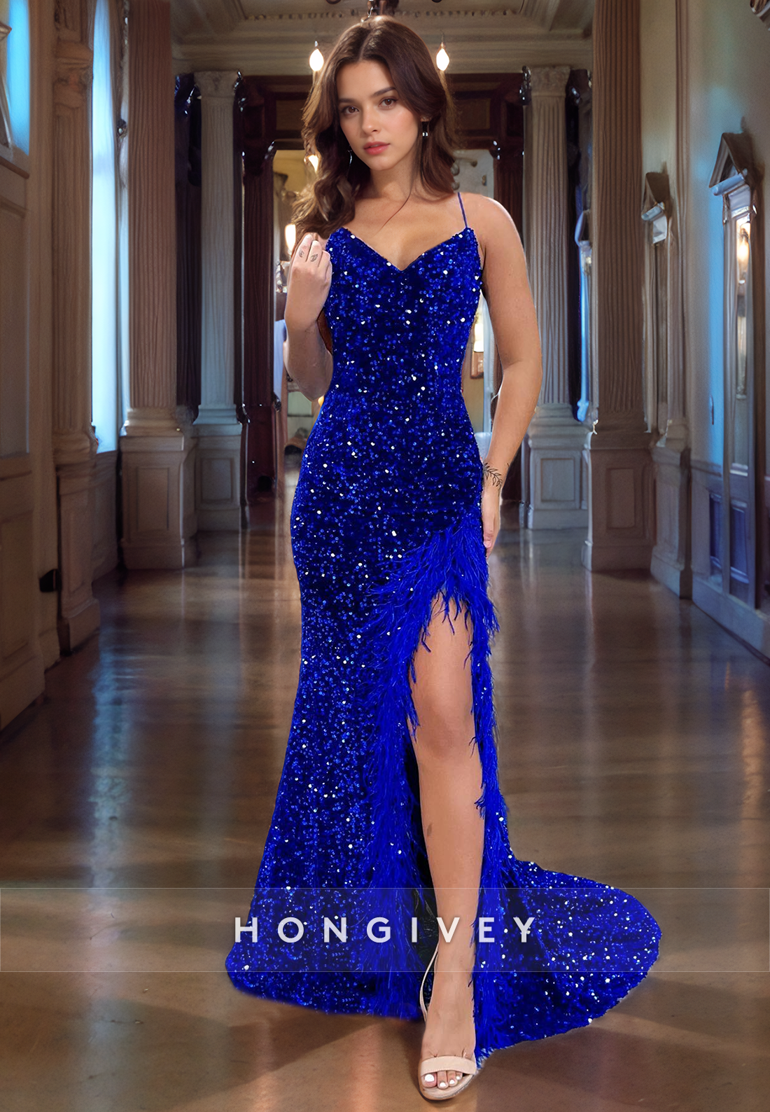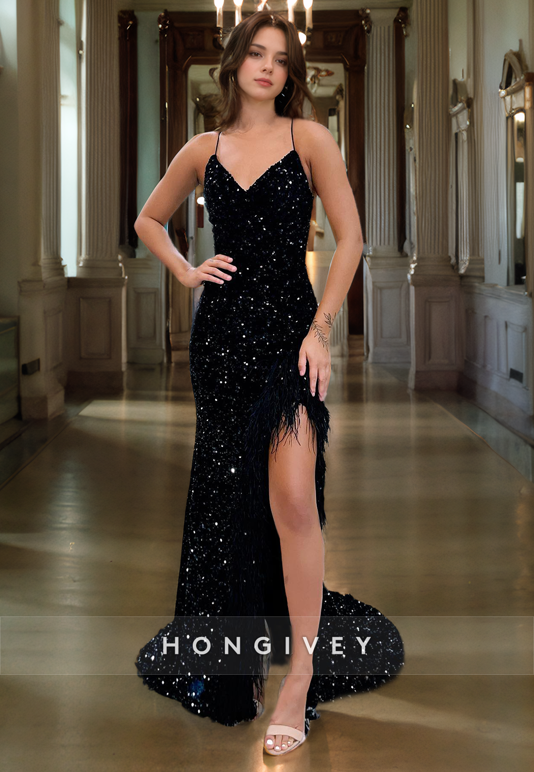 Sparkle Sequined Feathers Spaghetti Straps V-Neck Evening Dress Formal Party Gown