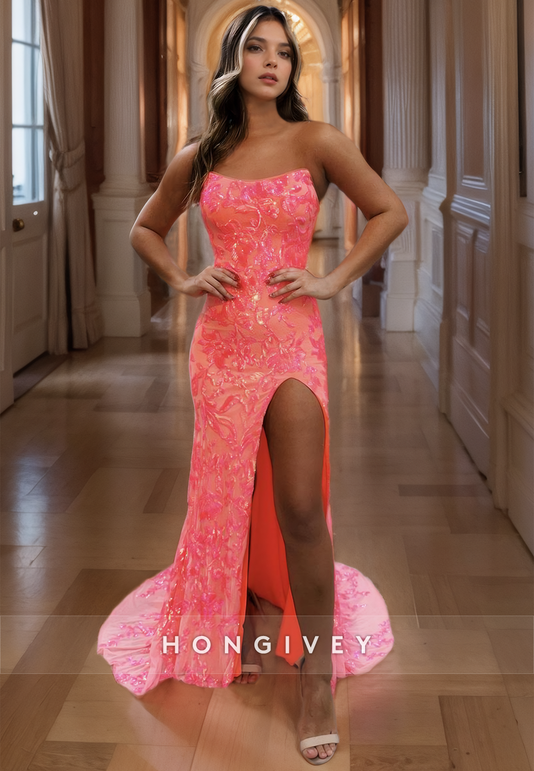 This elegant L2711 dress features a timeless bateau neckline and a flattering strapless design. The sequined appliques add a touch of shimmer, while the side slit train adds a modern twist. Perfect for parties, proms, and evening events.