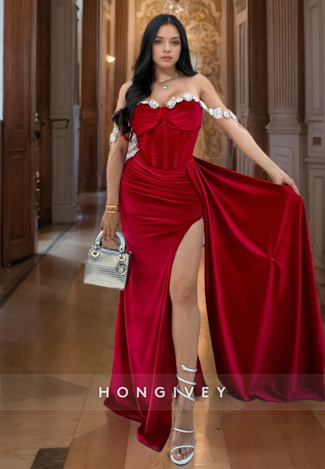 HONGIVEY Stunning Beaded Off-Shoulder Evening Dress Side Slit Ruched Party Gown