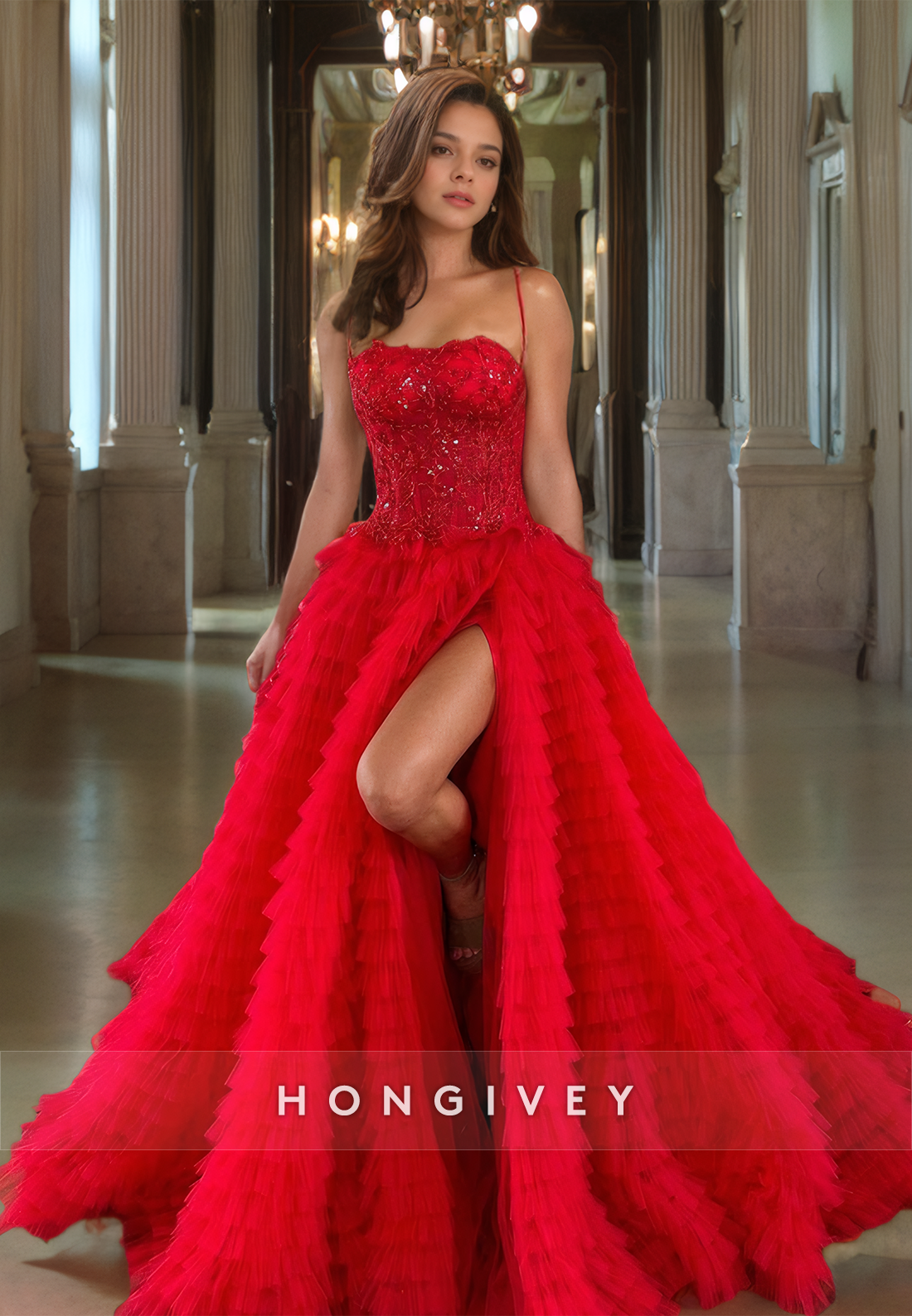 Unique Sweetheart Red A-Line Prom Dress Tiered Tulle Straps Side Slit Floor Length Quinceanera Dress