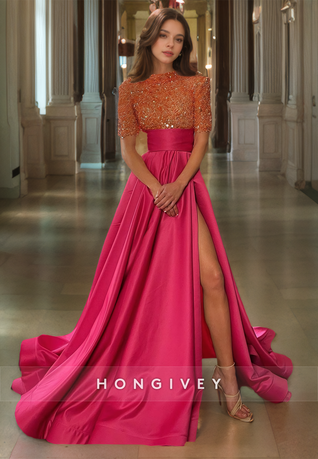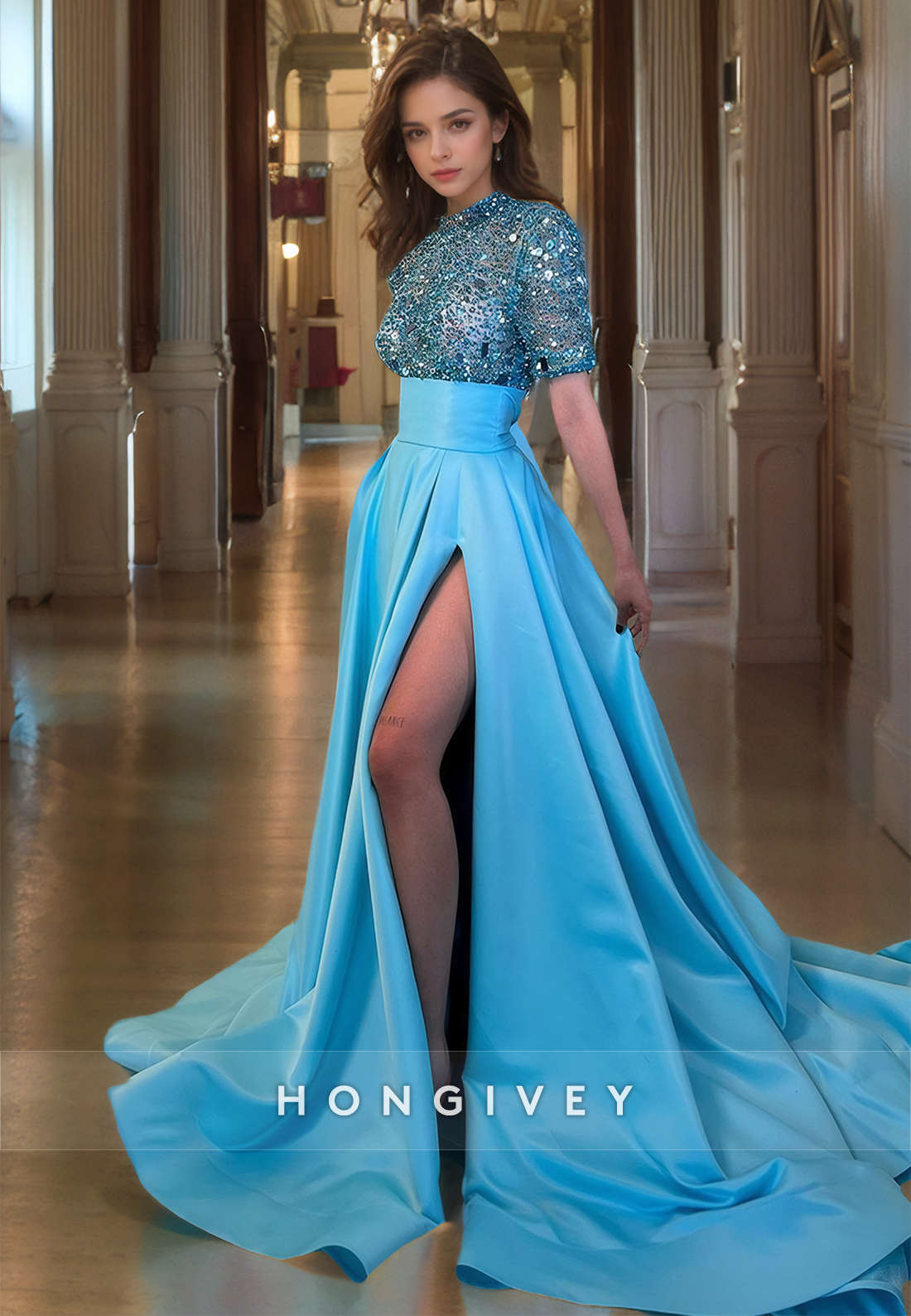 A-Line O Neck Sequins Prom Dress with Short Sleeves Floor Length Satin Elegant Party Gown