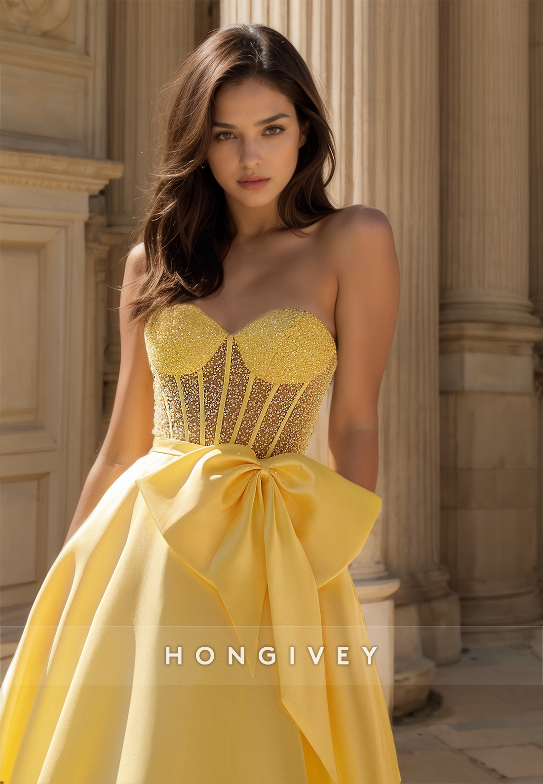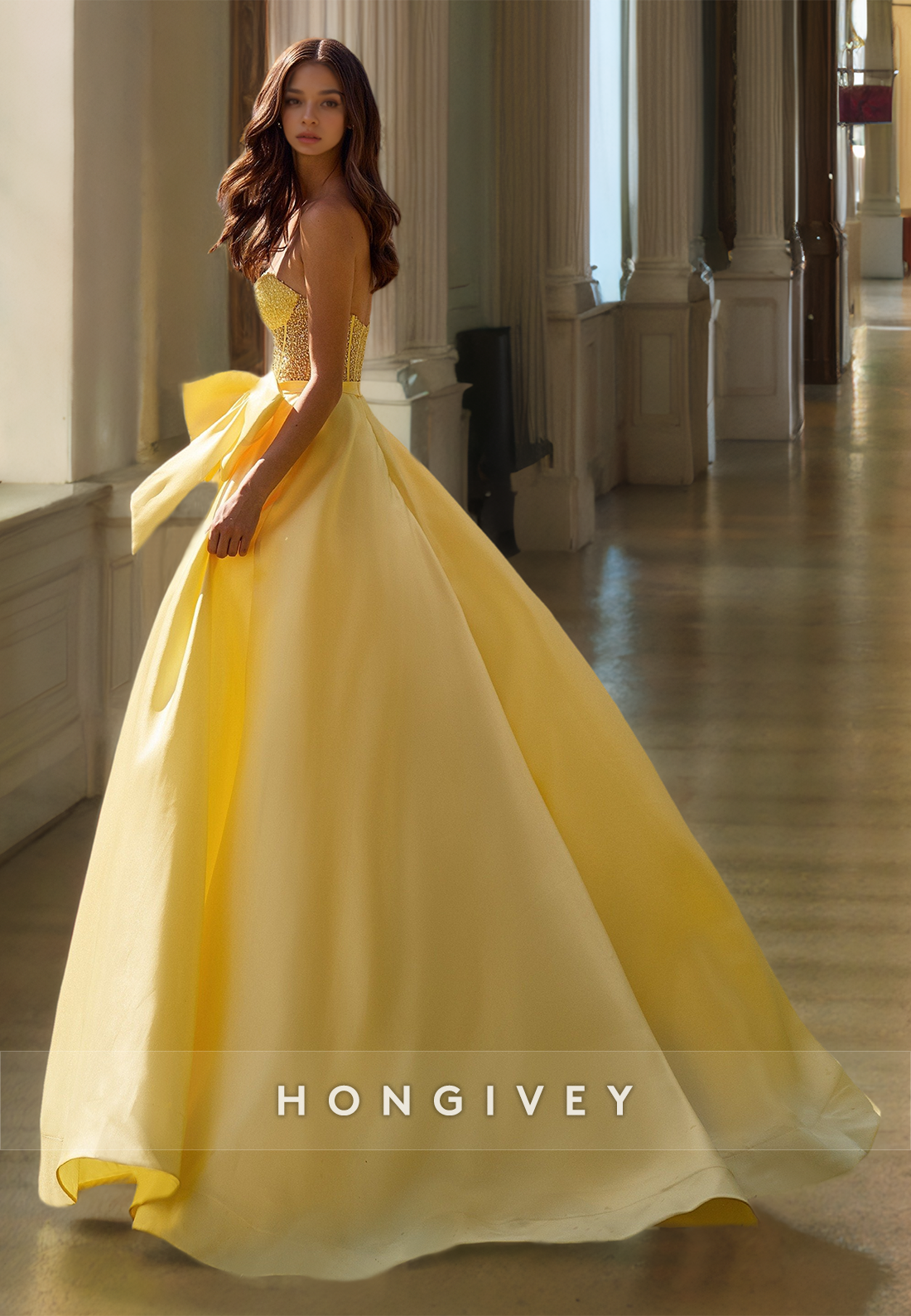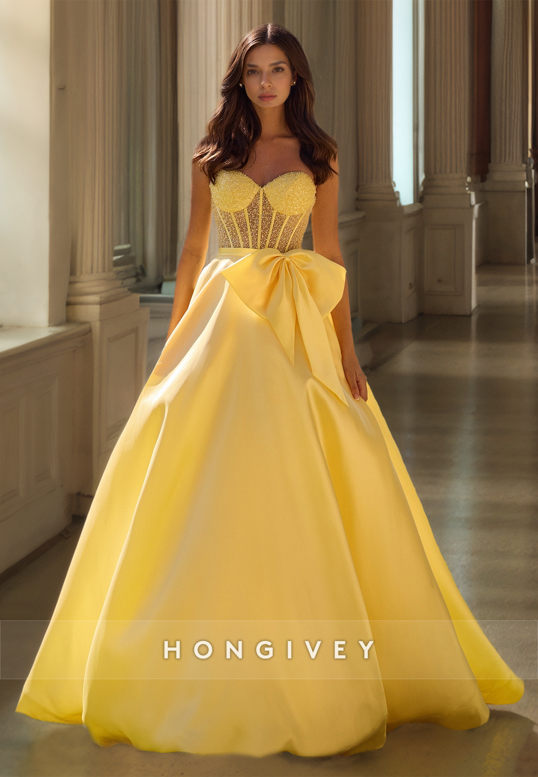 HONGIVEY Sweetheart Bow Prom Gown A-Line Evening Dress Yellow Quinceanera Dresses