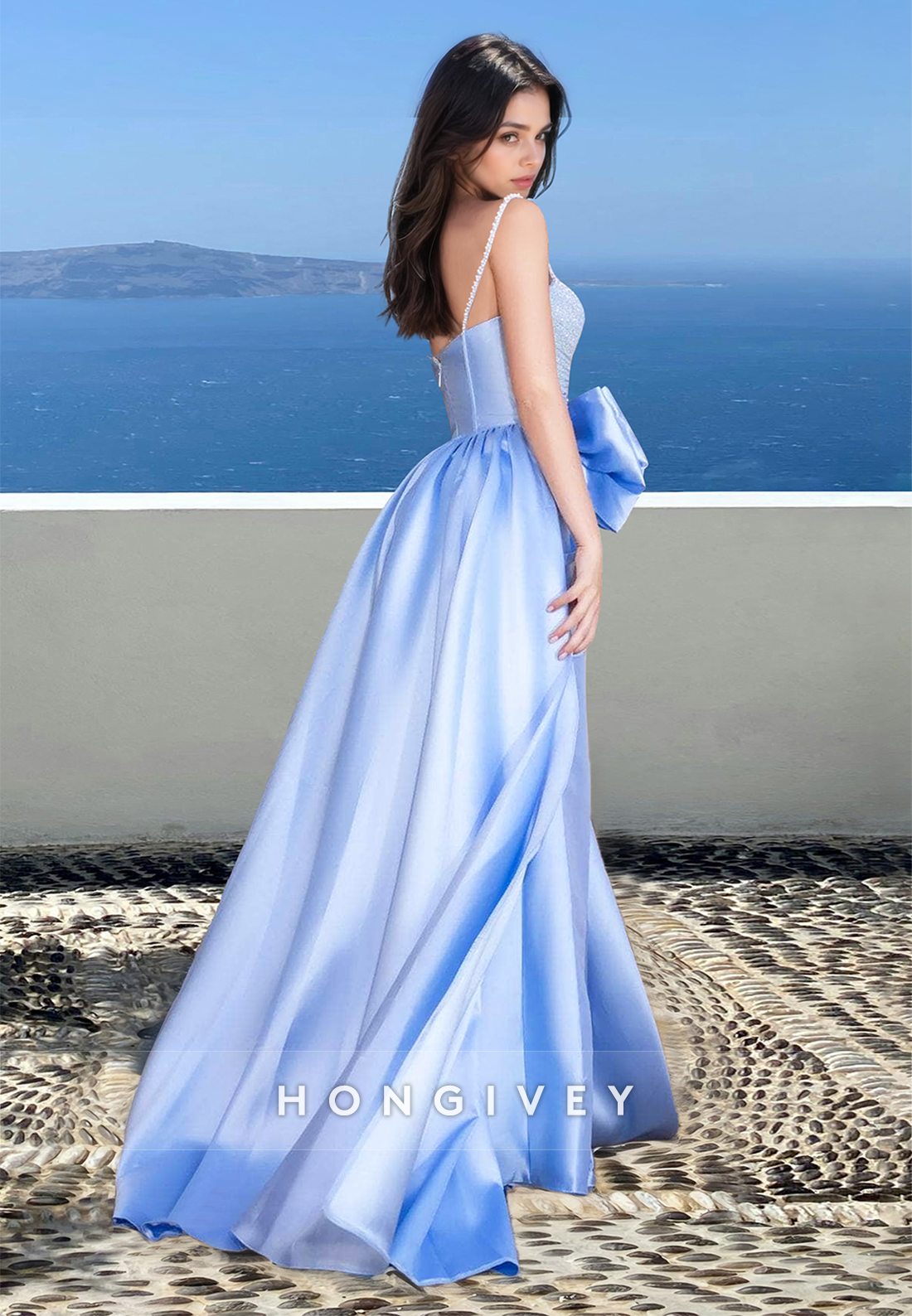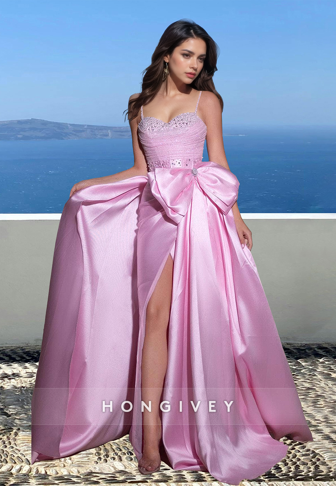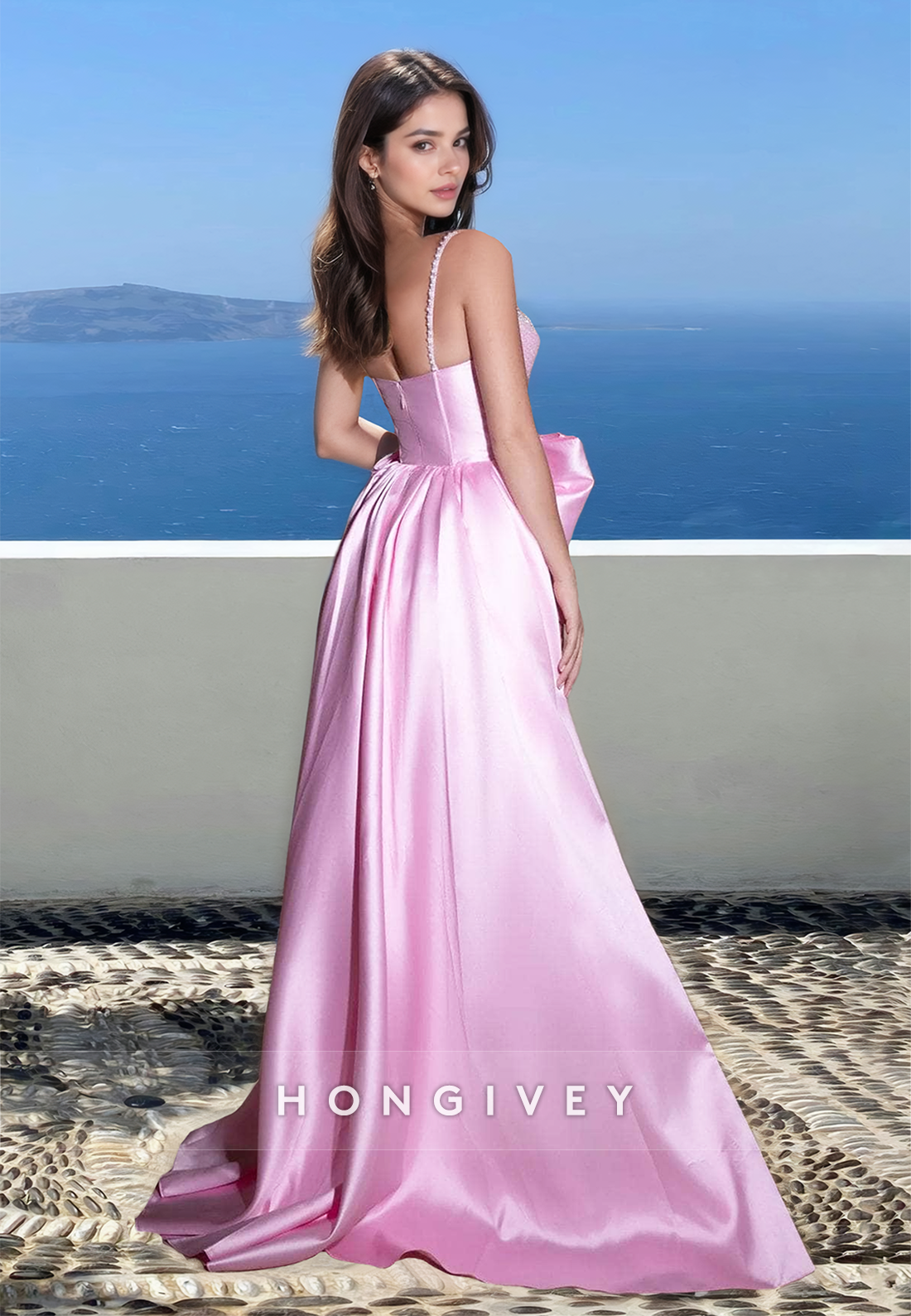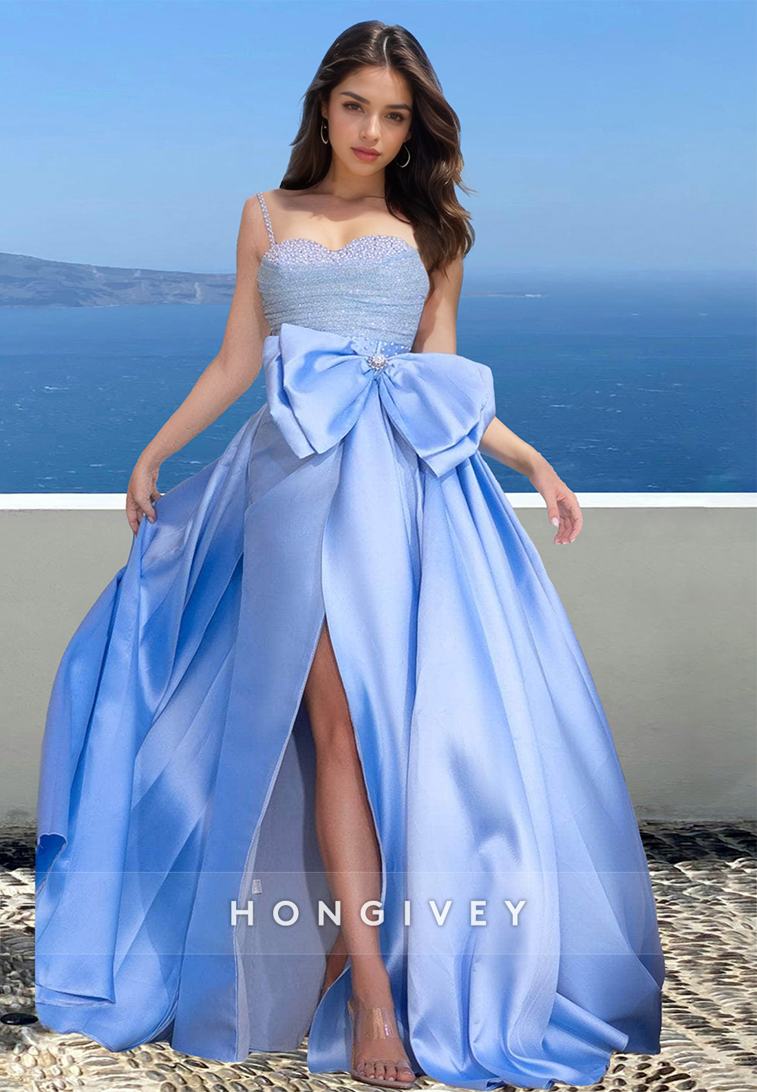 Chic Sweetheart Straps Bow A-Line Satin with Side Slit Prom Gown Party Ball Gown
