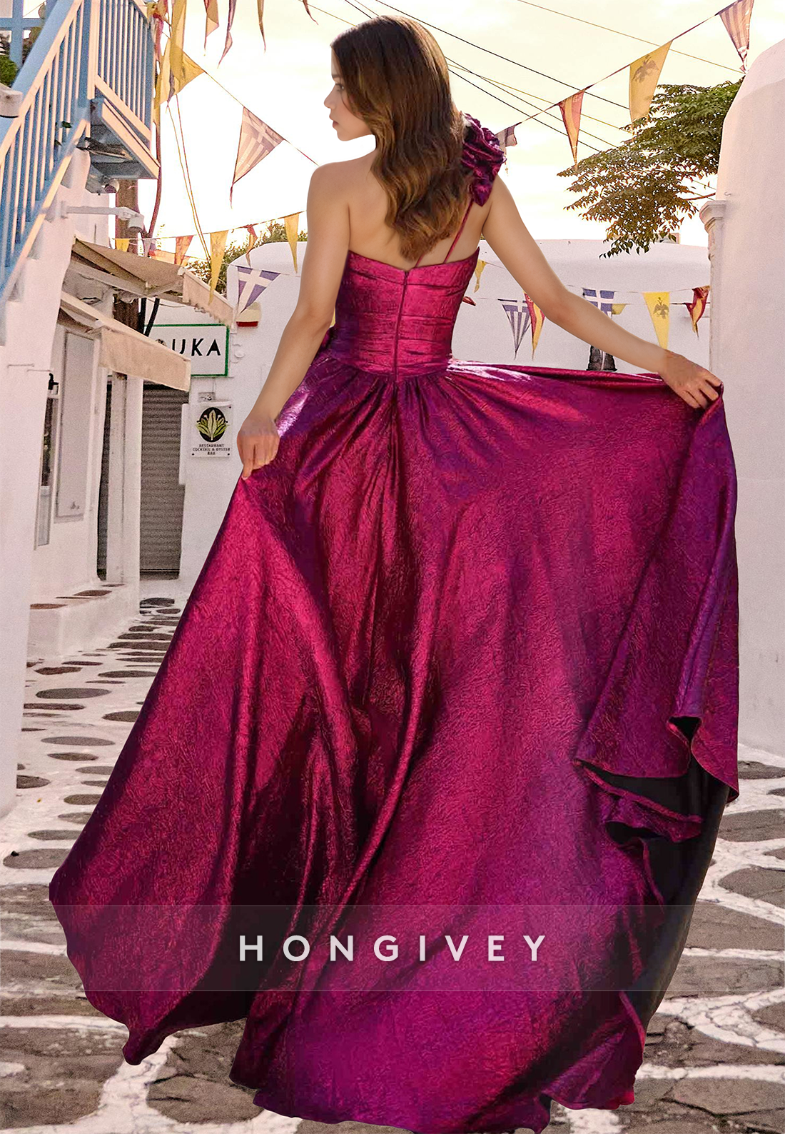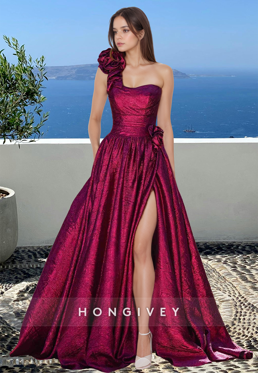 Floral One Shoulder A-Line Satin Formal Evening Dress Prom Gown Ball Gown