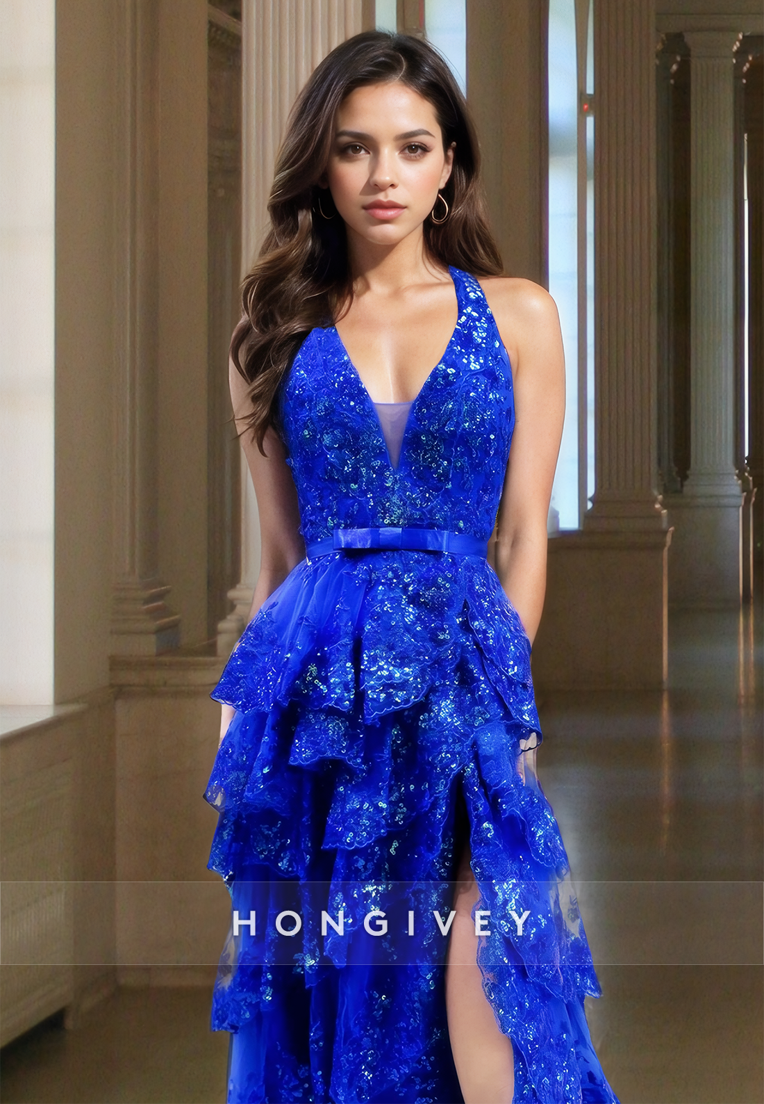 Elevate your formal look with our Blue Tiered Prom Dress from HONGIVEY. This A-Line design boasts sparkling floral accents and elegant straps. The tiered skirt adds dimension and charm to this formal ball gown. Make a statement at your next event and turn heads in this stunning dress.