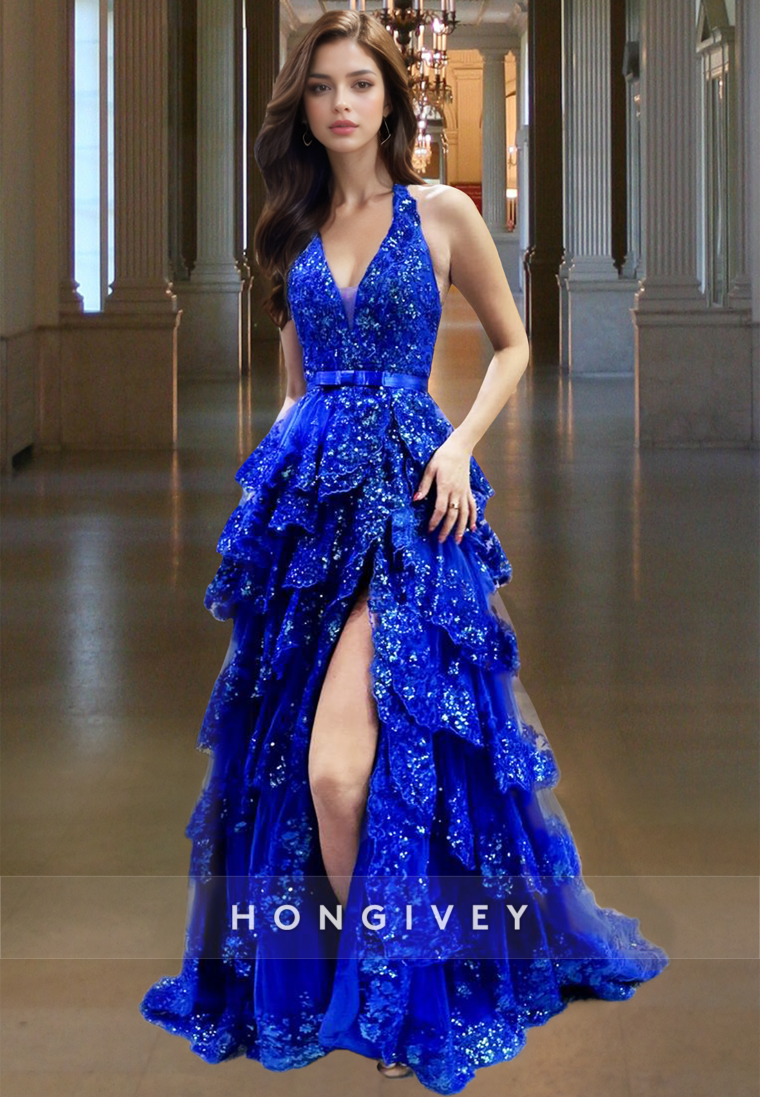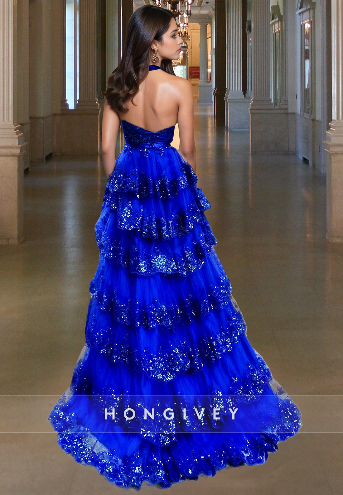 Blue Tiered Prom Dress Sparkle Floral Straps A-Line Formal Ball Gown HONGIVEY