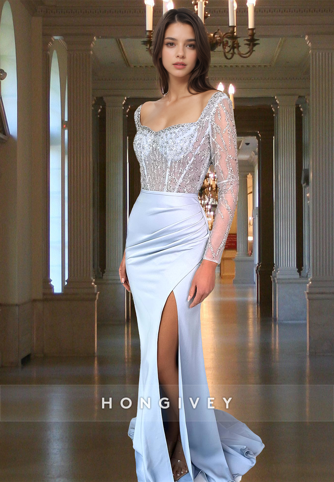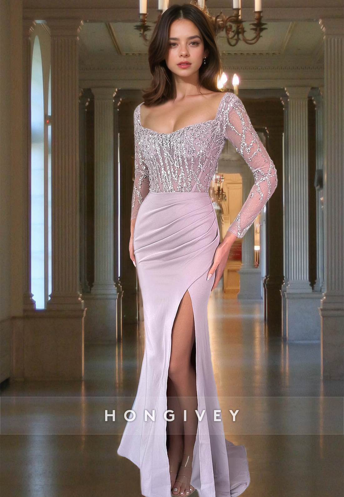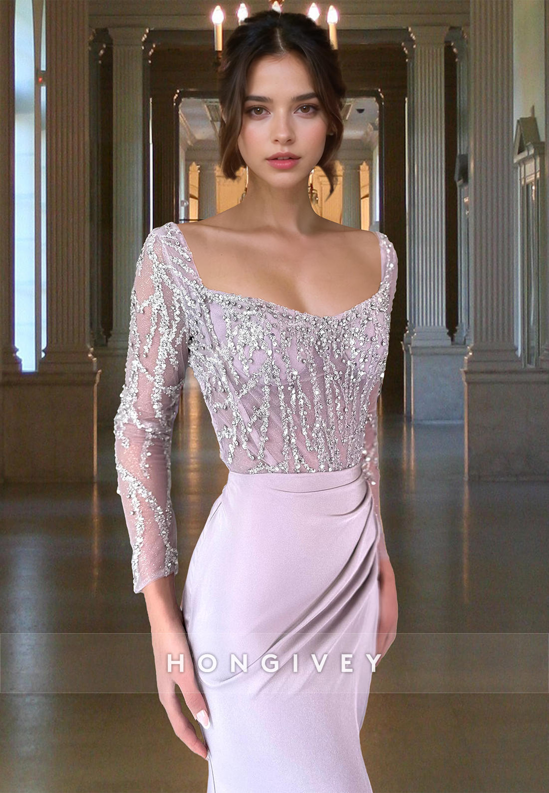 Scoop Long Sleeves Glitter Beaded Evening Dress Formal Party Gown