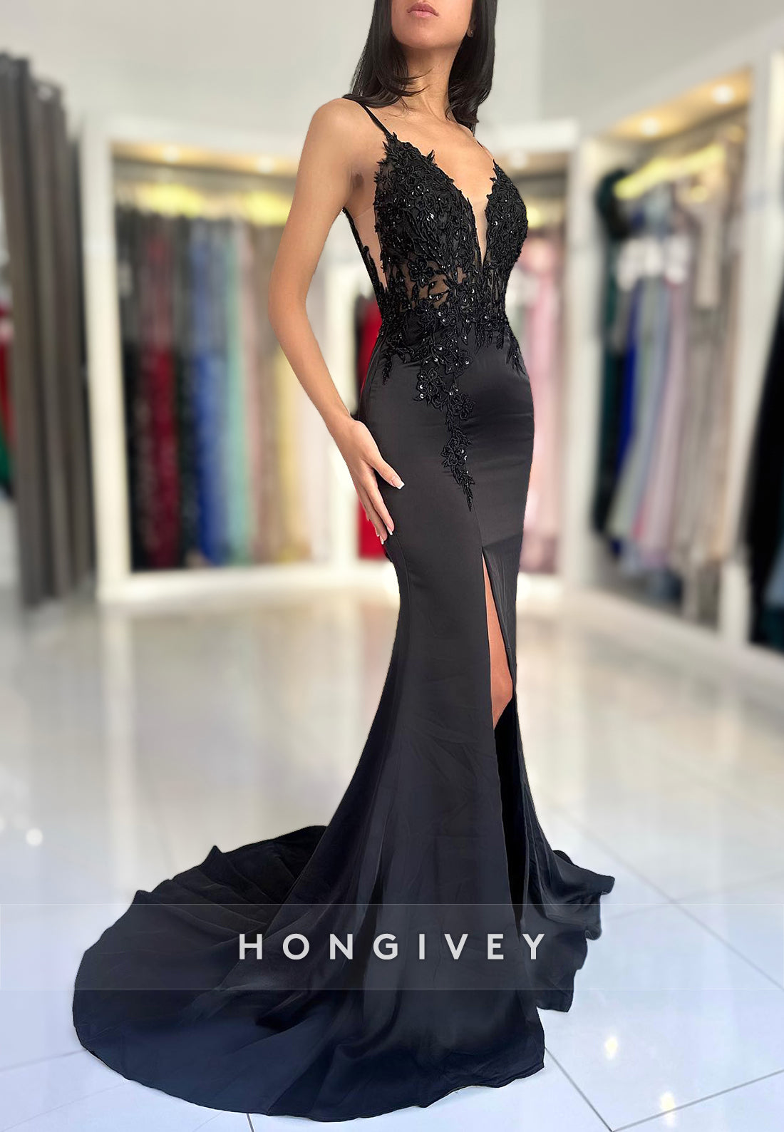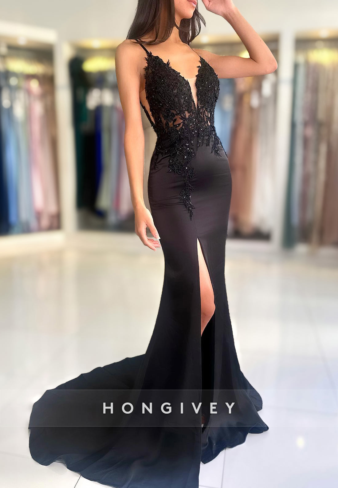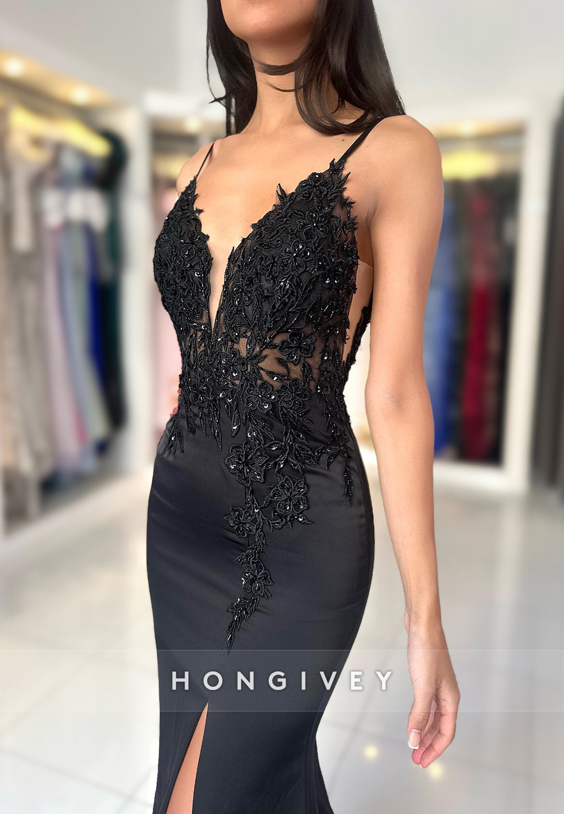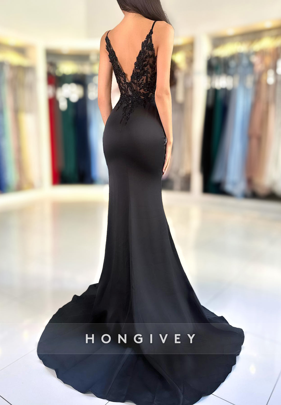 Sexy Black V-Neck Sheer Open Back Mermaid Evening Dress Gown HONGIVEY