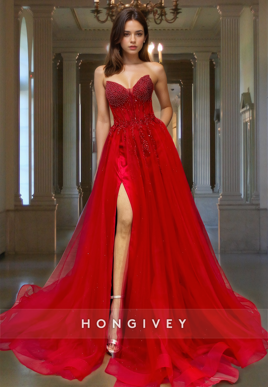Red Sweetheart A-Line Tulle Prom Dress Applique Beaded Strapless Ball Gown
