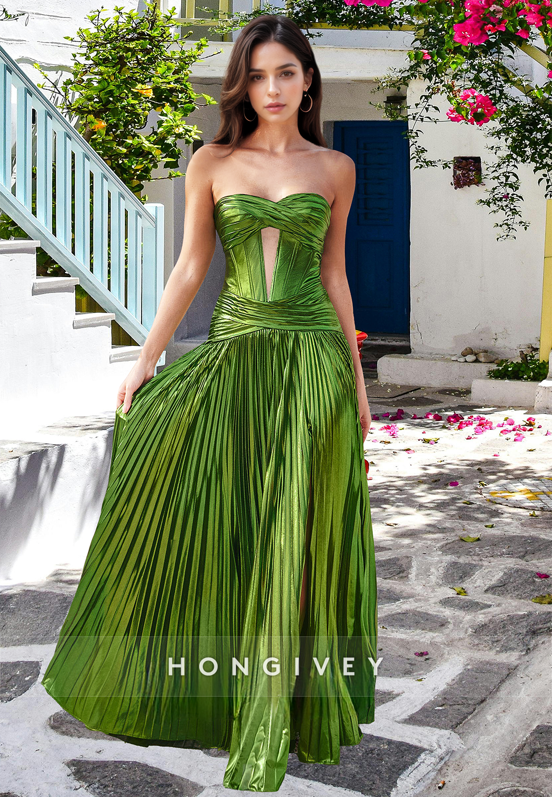 Introducing the Sexy Green Strapless Pleated A-Line with Slit Prom Dress from HONGIVEY. The elegant A-Line design and sultry slits create a flattering silhouette while the stunning green color adds a touch of sophistication. Perfect for prom or any special occasion, this dress is sure to turn heads.