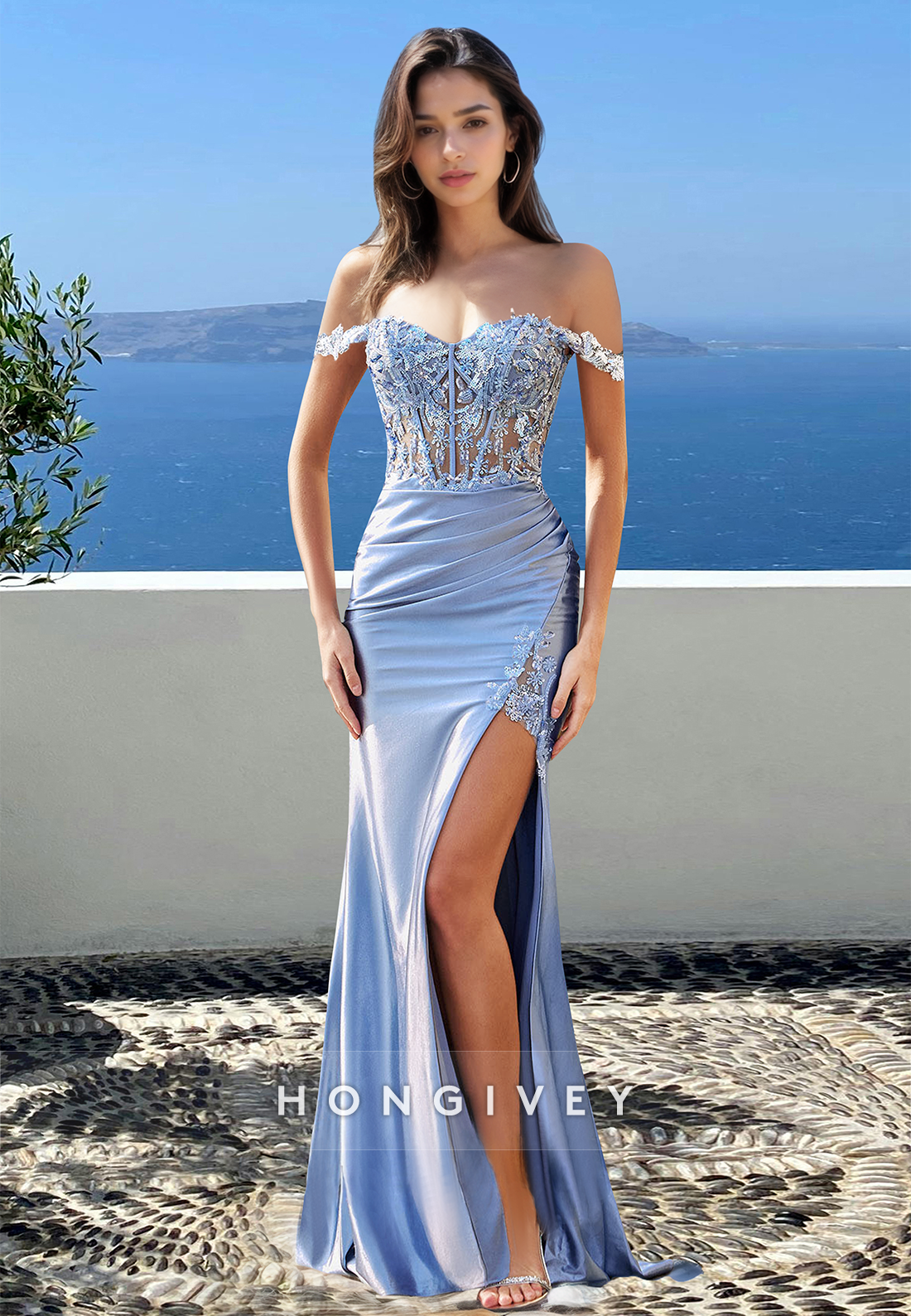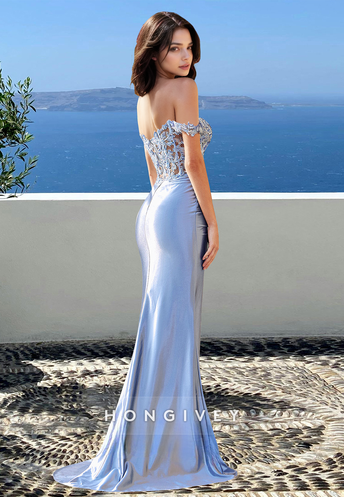 Sexy Sheer Apllique Sheath Off-Shoulder Satin Formal Evening Dress HONGIVEY