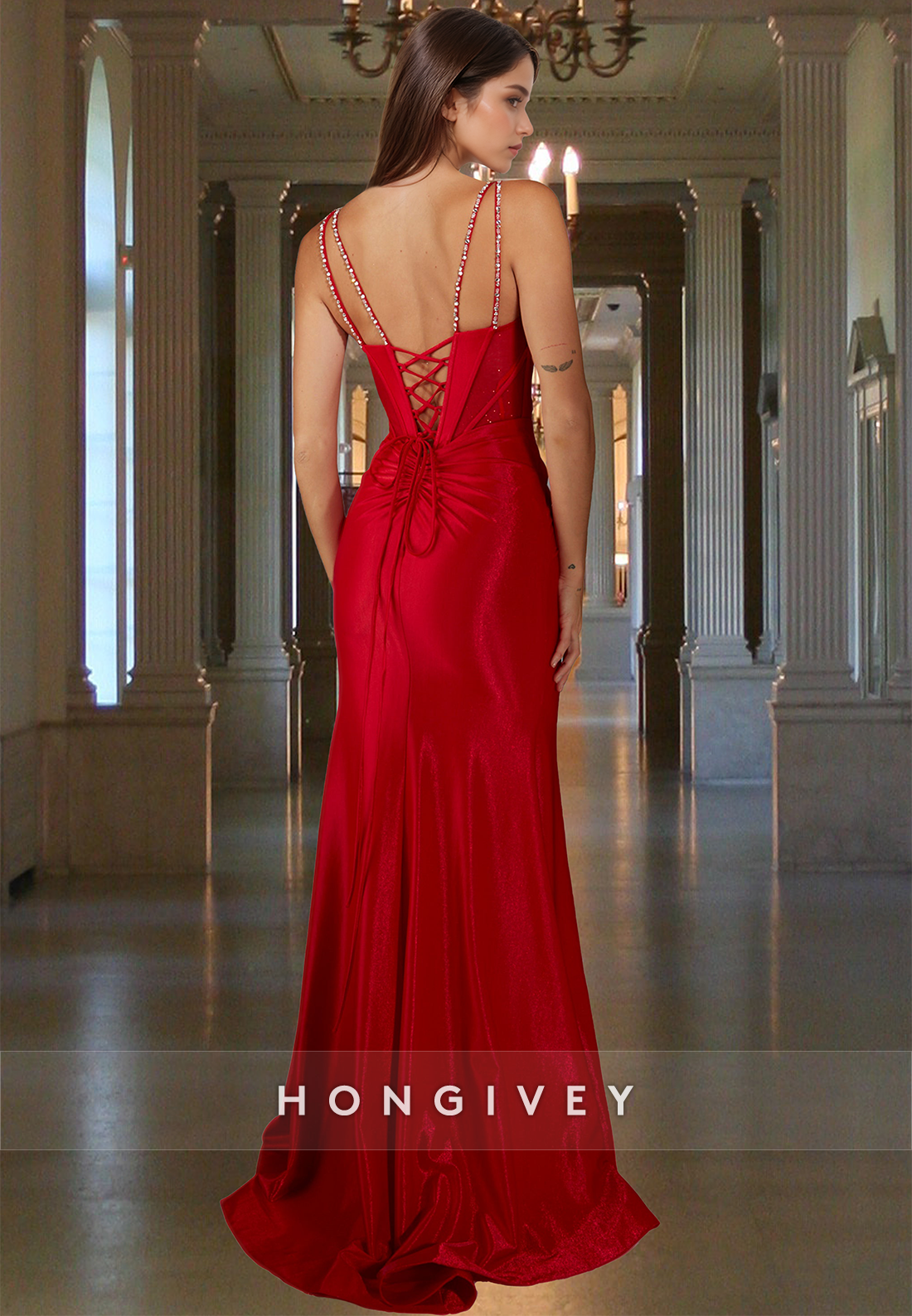 Hot Beaded Spaghetti Straps with Slit Red Sexy Satin Formal Evening Dress